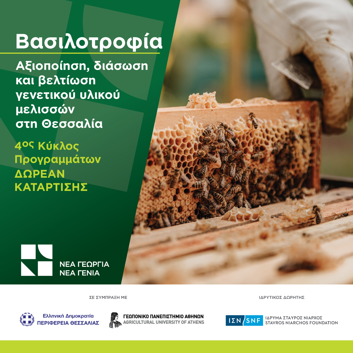 Ο Οργανισμός «Νέα Γεωργία Νέα Γενιά» και η Περιφέρεια Θεσσαλίας, σε συνεργασία με το Γεωπονικό Πανεπιστήμιο Αθηνών, ανακοινώνουν την έναρξη του δωρεάν προγράμματος κατάρτισης και συμβουλευτικής με θέμα «Βασιλοτροφία: Αξιοποίηση, διάσωση και βελτίωση γενετικού υλικού μελισσών στη Θεσσαλία».
