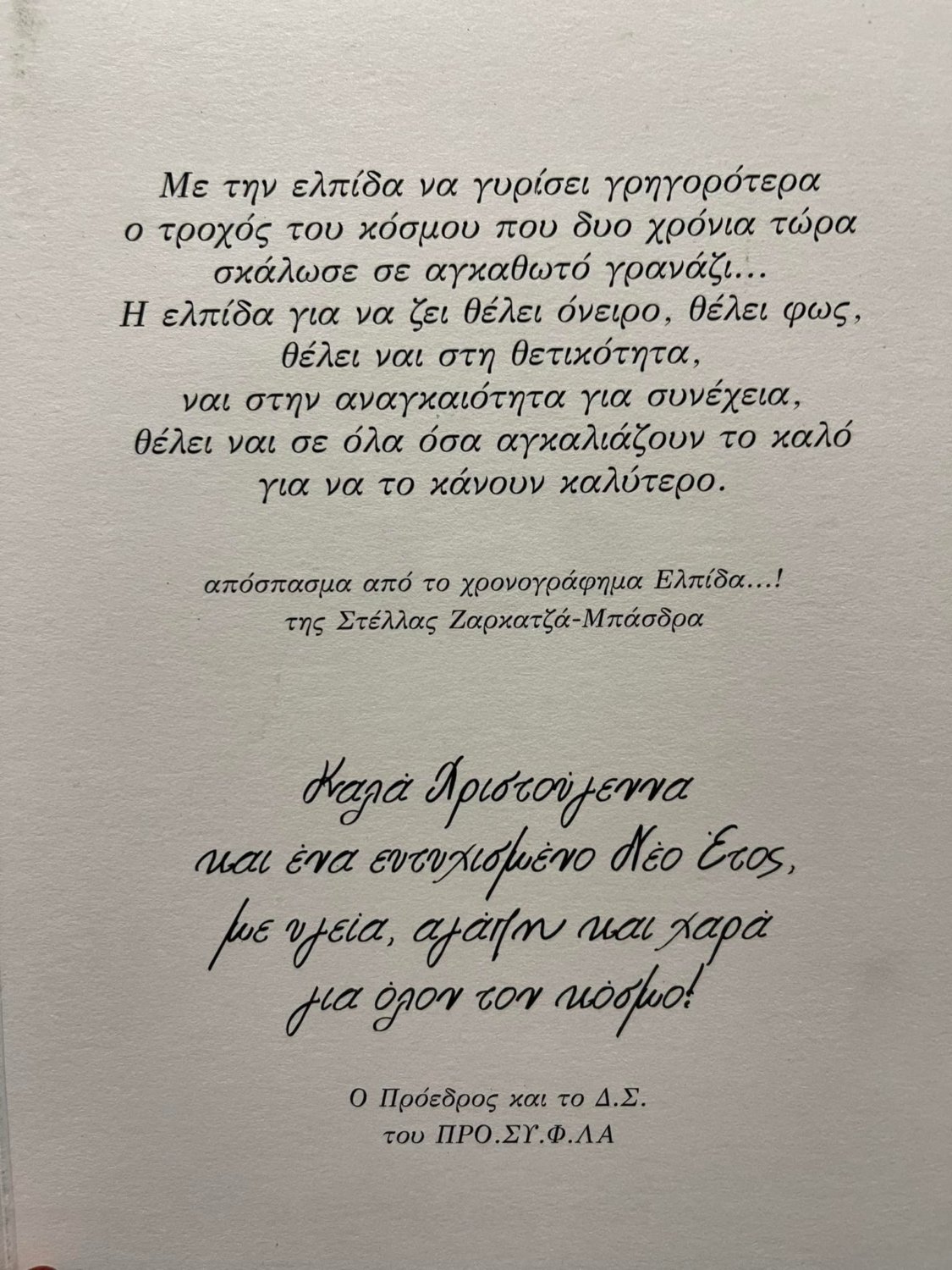 Με ένα απόσπασμα από το χρονογράφημα υπό τον τίτλο «Ελπίδα», της Στέλλας Μπάσδρα που δημοσιεύθηκε στην larissanet, εύχεται Καλά Χριστούγεννα και Ευτυχισμένο έτος ο Προμηθευτικός Συνεταιρισμός Φαρμακοποιών Λάρισας στην ευχετήρια κάρτα του.