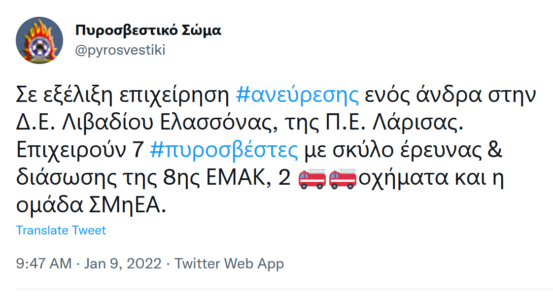 Με ανάρτηση στο twitter η Πυροσβεστική Υπηρεσία ενημερώνει για την επιχείρηση ανεύρεσης νεαρού ατόμου που εξελίσσεται στο Λιβάδι Ελασσόνας.