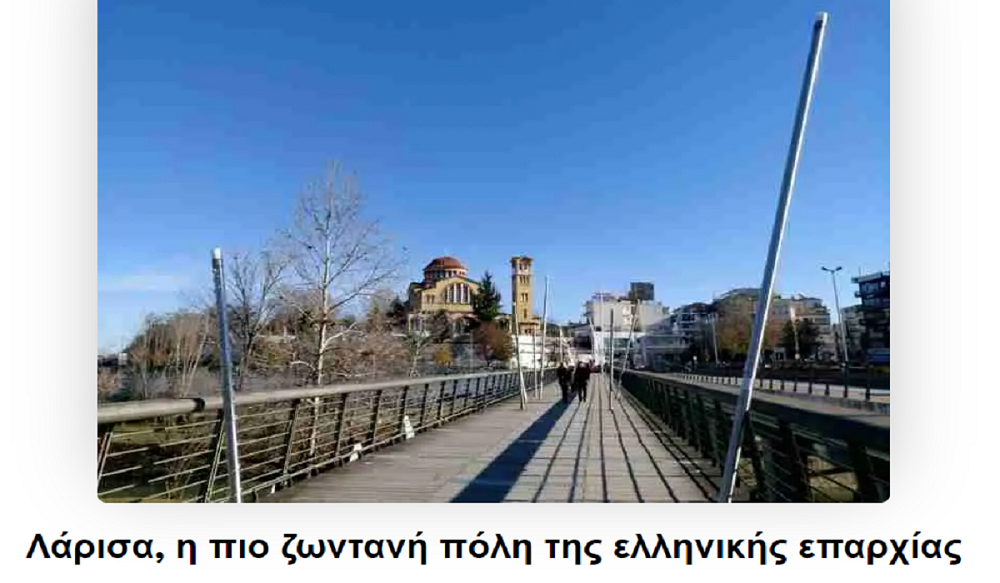 Αυτός είναι ο τίτλος που δίνει σε αφιέρωμά του, ΜΜΕ από την Ελληνική Ομογένεια της Αμερικής και εντόπισε το Larissanet.gr. Συγκεκριμένα στην ιστοσελίδα του το Ελληνοαμερικανικό δίκτυο ενημέρωσης της Florida “Greek News and Radio FL”, έχει εκτενές ρεπορτάζ στο οποίο αναφέρεται μεταξύ άλλων πως η Λάρισα «δεν αποτελεί μόνο το οικονομικό και πολιτιστικό κέντρο της Περιφέρειας Θεσσαλίας, αλλά και -γεωγραφικά τουλάχιστον- την «καρδιά» ολόκληρης της Ελλάδας, μιας και απέχει σχεδόν εξίσου από οποιοδήποτε σημείο της ελληνικής επικράτειας!».