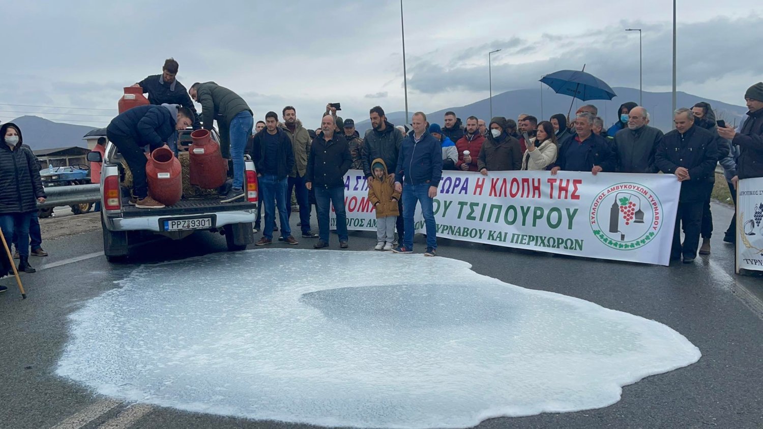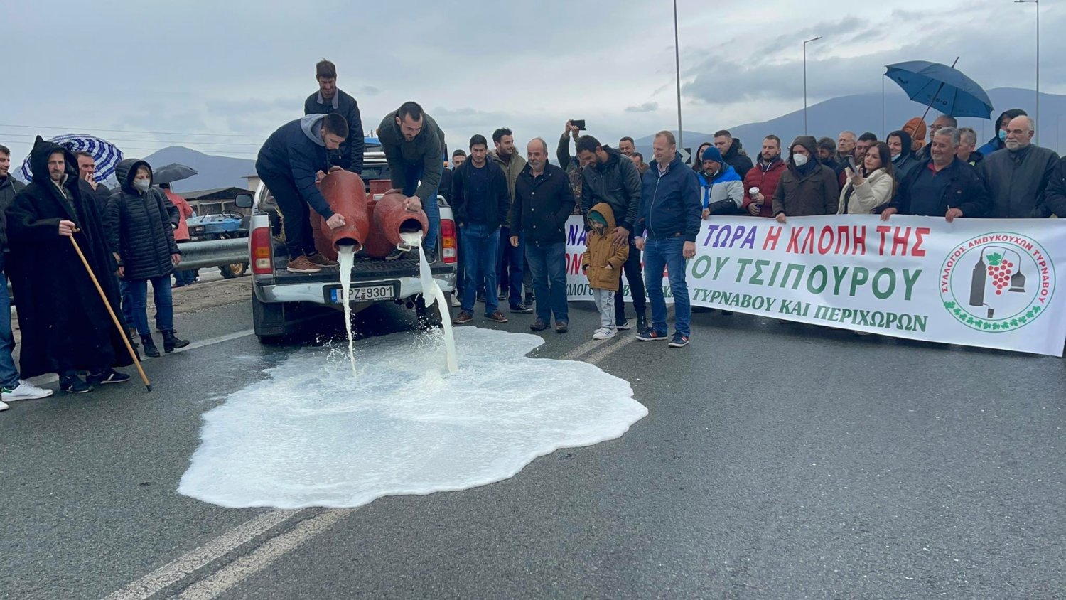 Στο πλαίσιο της διαμαρτυρίας τους έχυσαν γάλατα στο οδόστρωμα, ενώ πέταξαν και δέματα με άχυρα.