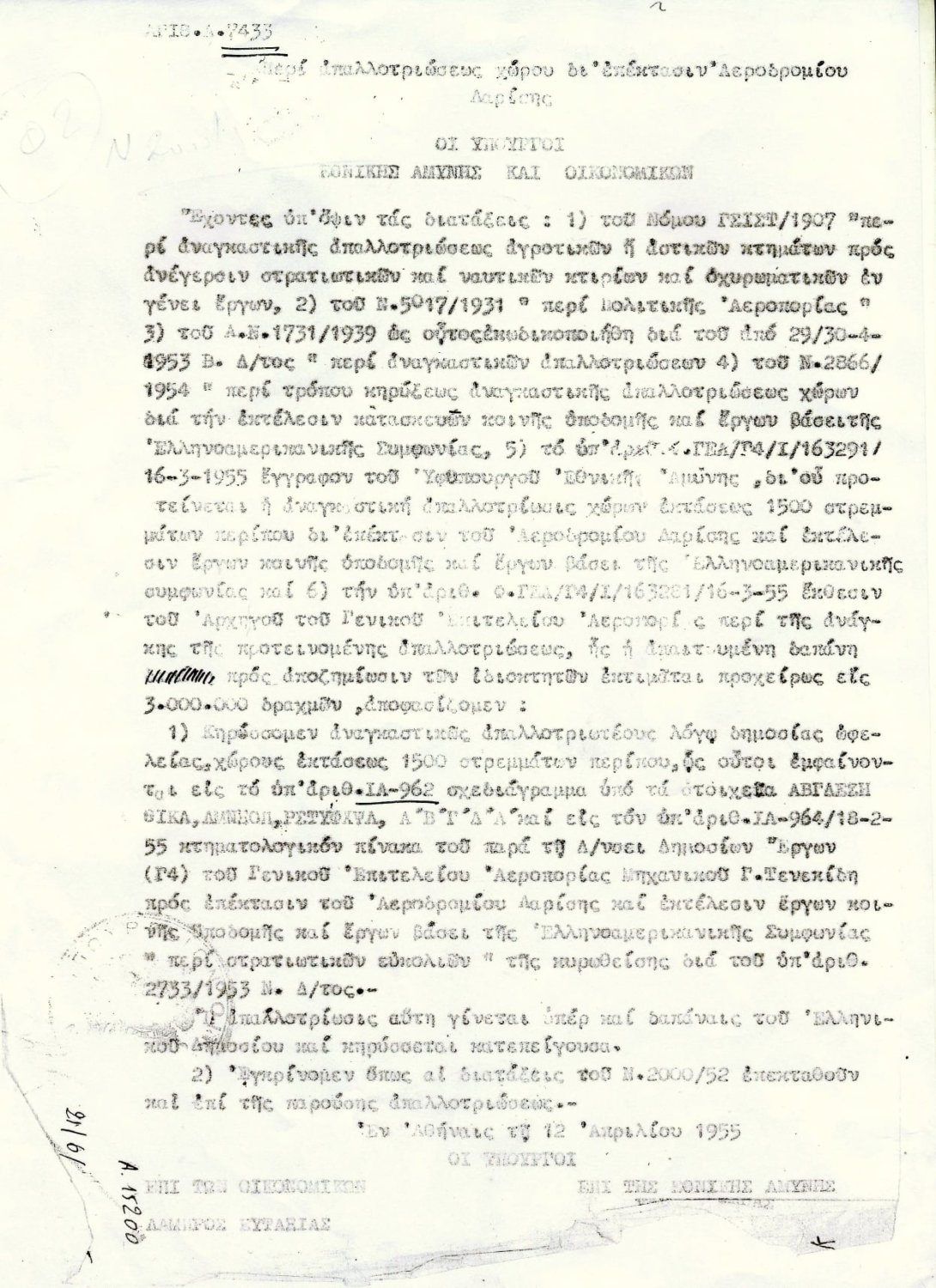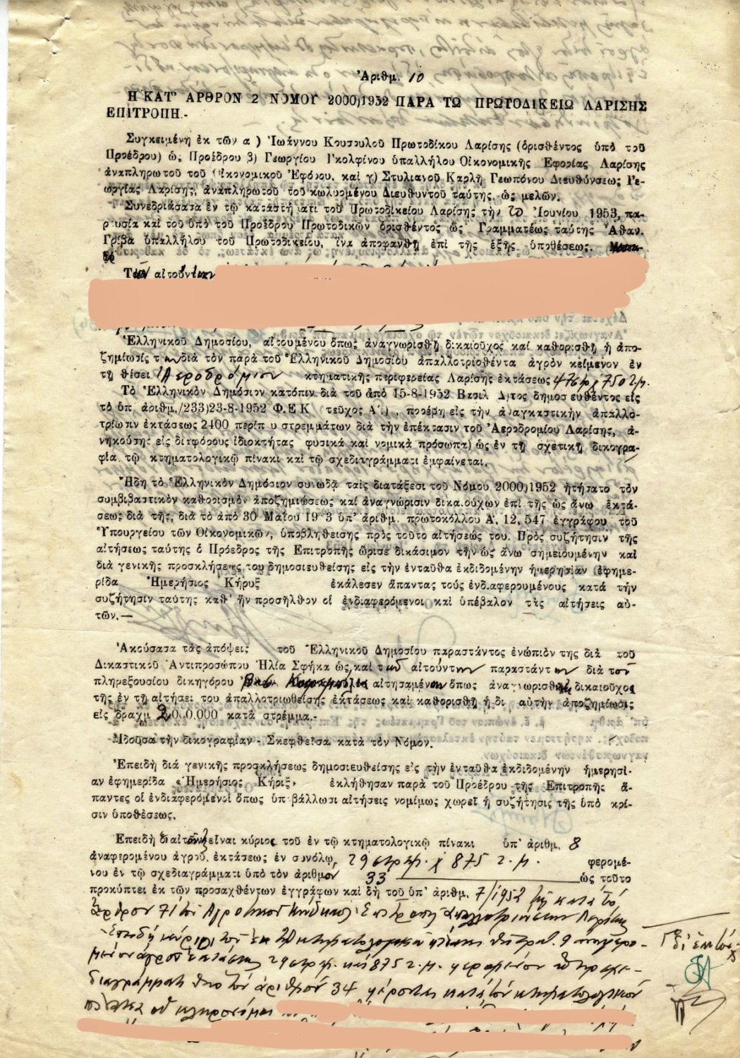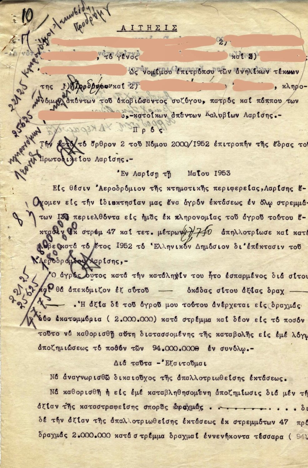 Από το Αρχείο Πρωτοδικείου Λάρισας διαπιστώθηκε από το Γενικό Αρχείο του Κράτους η προαναφερθείσα διαδικασία απαλλοτρίωσης κτημάτων για επέκταση του Αεροδρομίου Λάρισας το 1952.