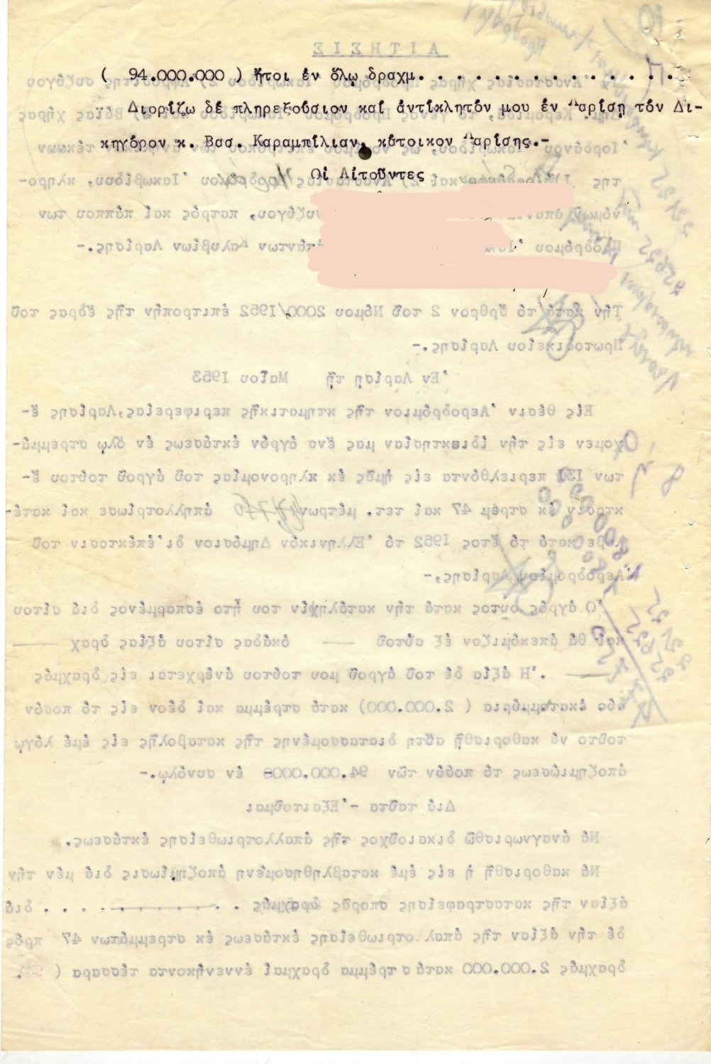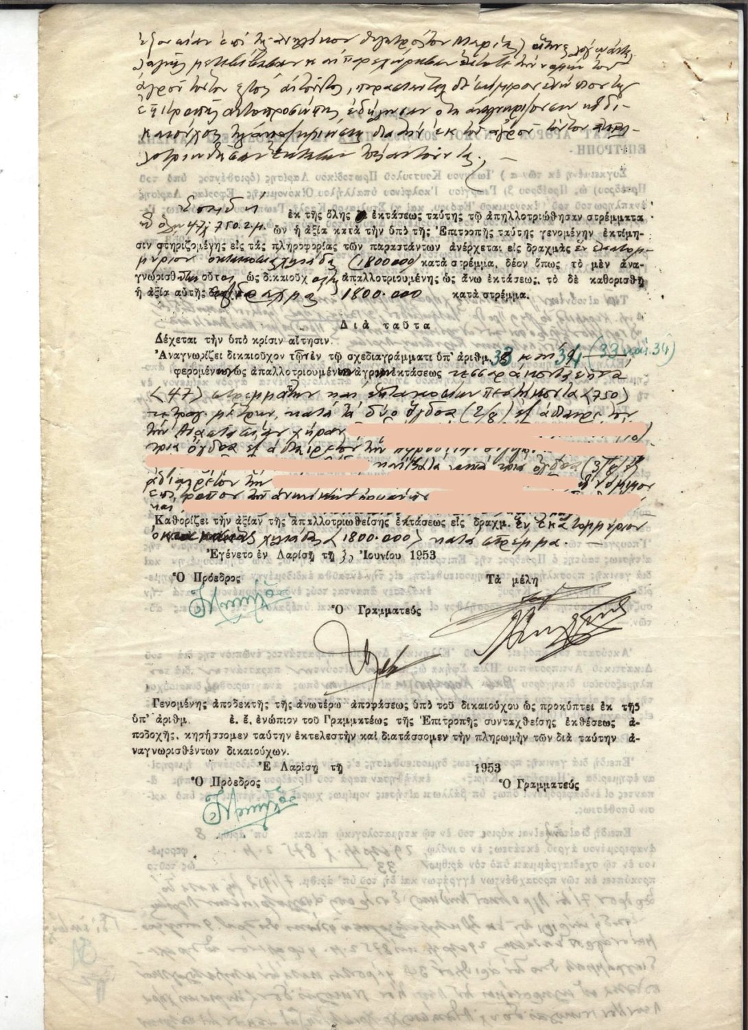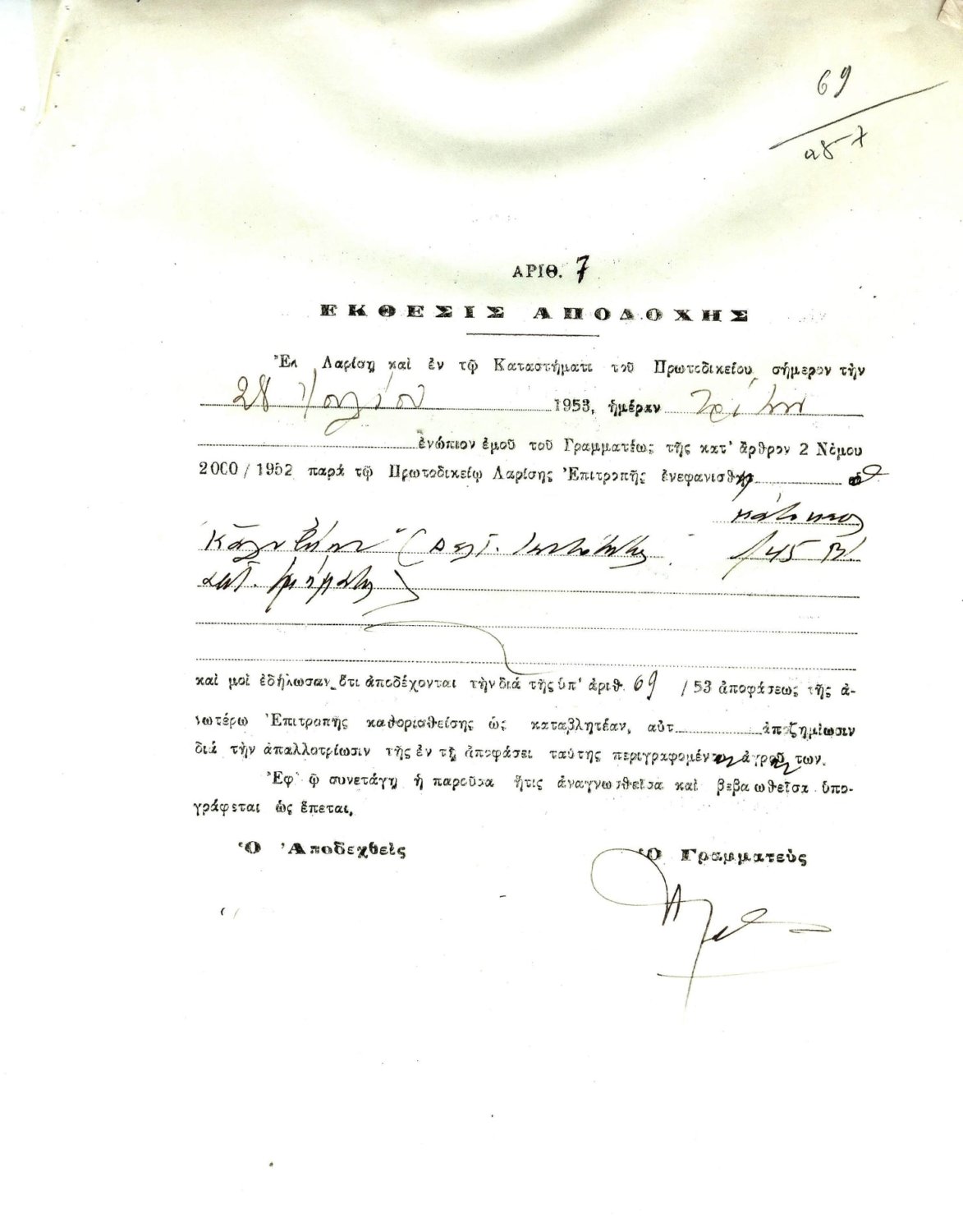 Από το Αρχείο Πρωτοδικείου Λάρισας διαπιστώθηκε από το Γενικό Αρχείο του Κράτους η προαναφερθείσα διαδικασία απαλλοτρίωσης κτημάτων για επέκταση του Αεροδρομίου Λάρισας το 1952.
