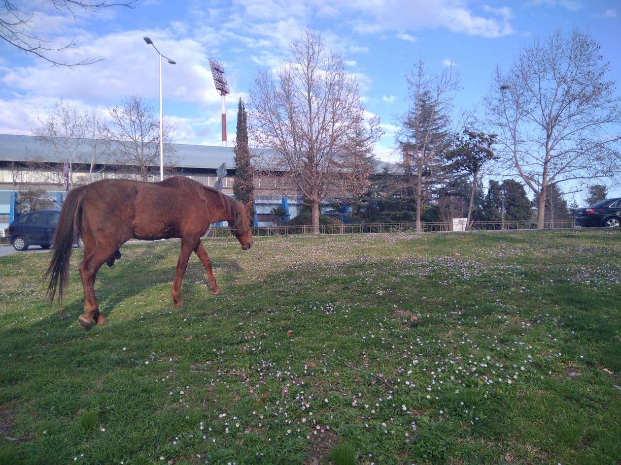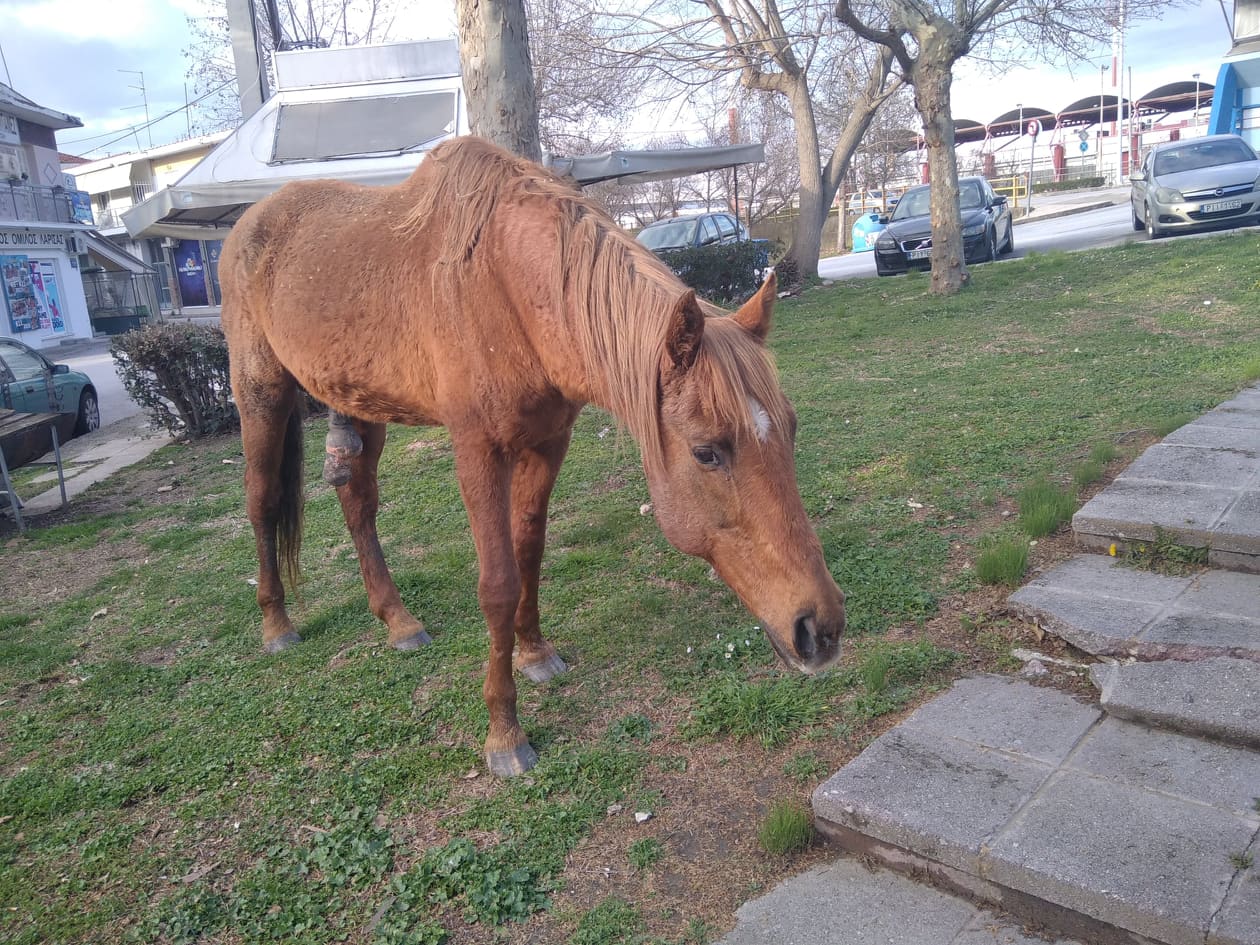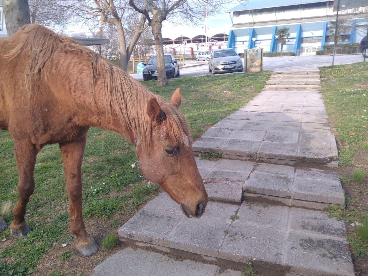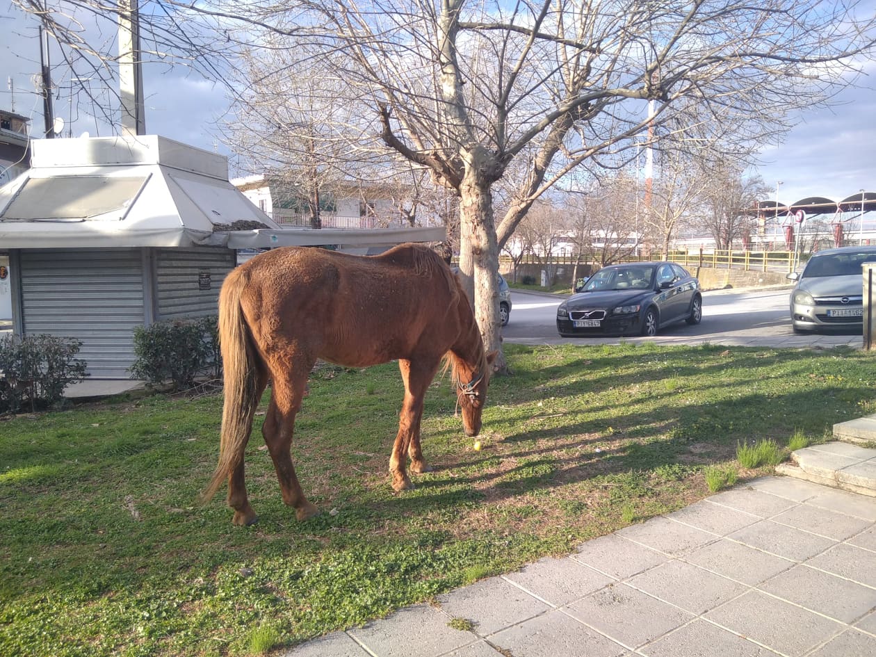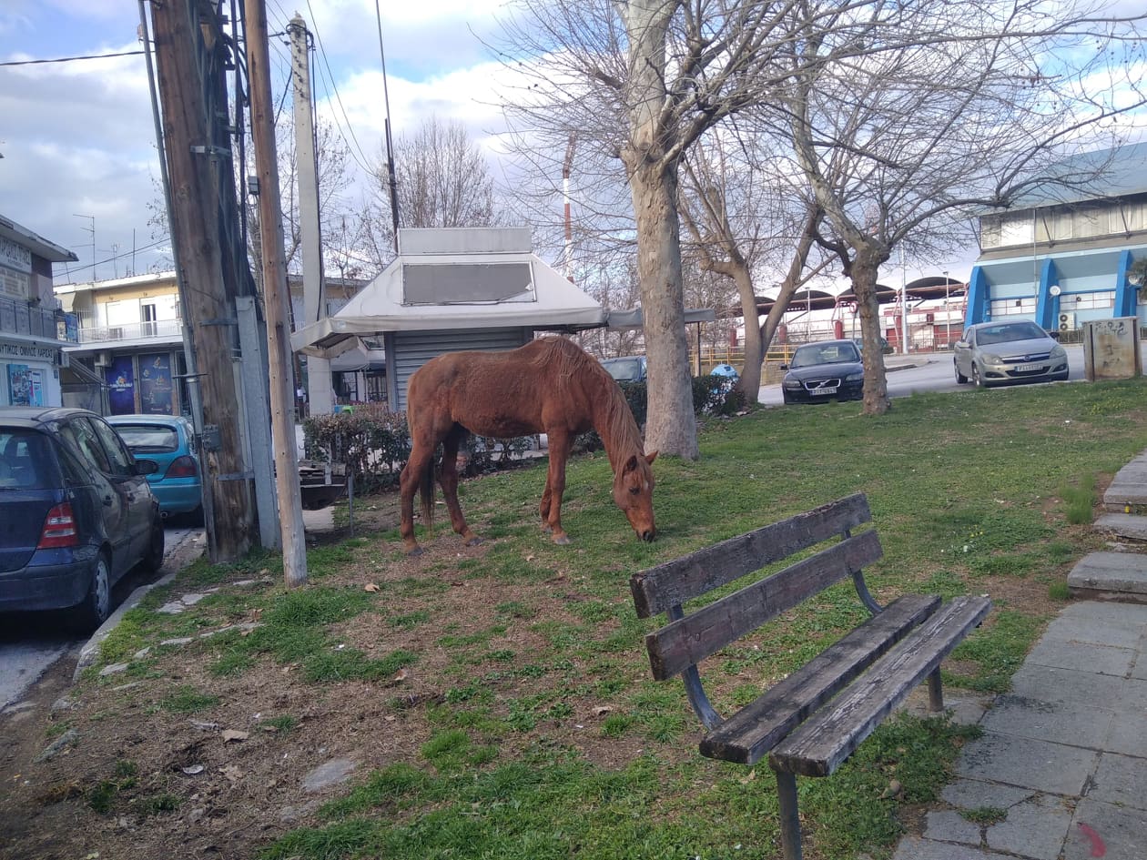 Χαρακτηριστικά λοιπόν και τα χθεσινά στιγμιότυπα ενός αλόγου απέναντι από το κλειστό κολυμβητήριο στο μικρό πάρκο να κάνει αμέριμνο και ατάραχο τη μικρή του βόλτα…