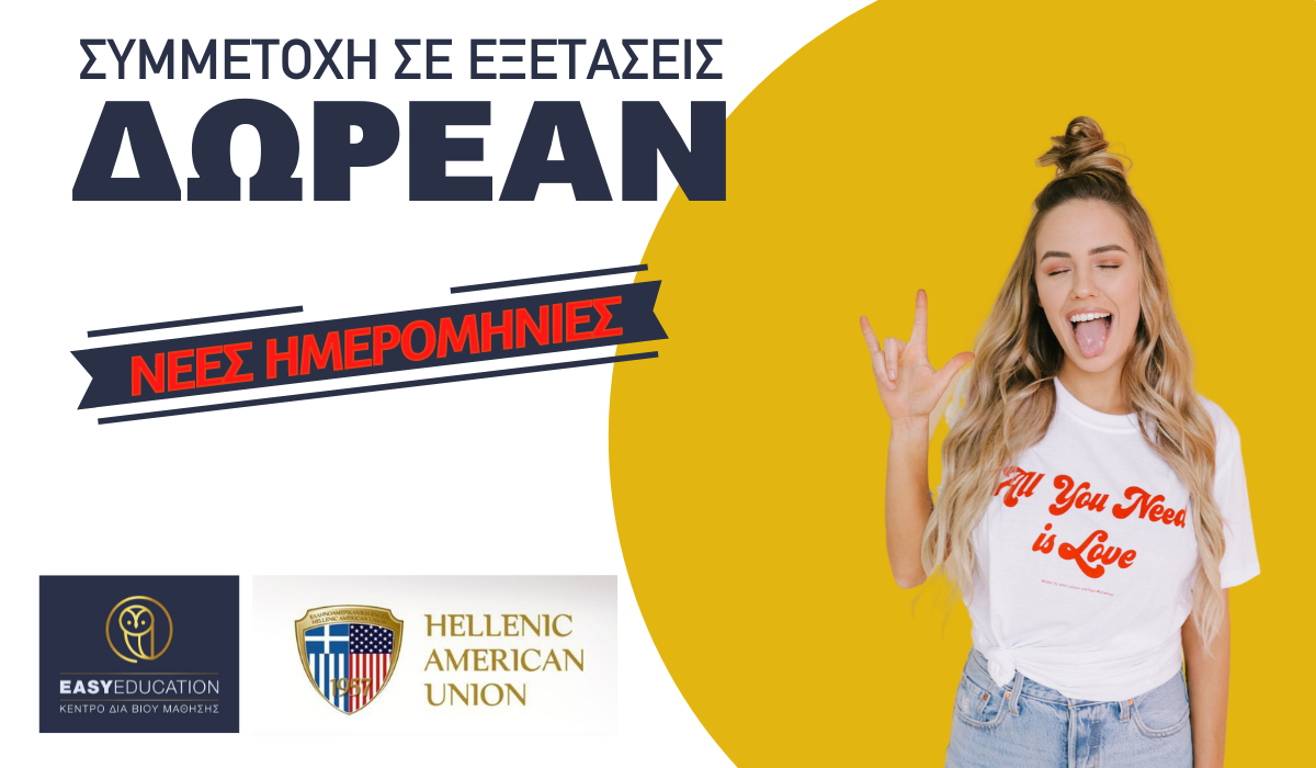 Τα Κέντρα Δια Βίου Μάθησης, Easy Education, στα πλαίσια της εταιρικής κοινωνικής ευθύνης, σε συνεργασία με την Ελληνοαμερικανική Ένωση, όντας άρρηκτα συνδεδεμένο με το σύνολο των εκπαιδευομένων πανελλαδικά και επιθυμώντας την περαιτέρω υποστήριξή τους, παρέχουν το δικαίωμα για δωρεάν εξ αποστάσεως προετοιμασία και για δωρεάν άμεση συμμετοχή σε εξετάσεις Αγγλικής Γλώσσας* με σκοπό να συμβάλλει καταλυτικά στην επιμόρφωση και πιστοποίηση όσο το δυνατόν περισσότερων ενδιαφερόμενων.