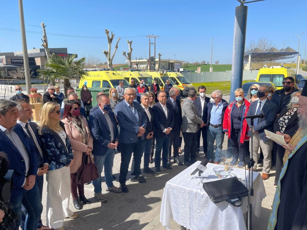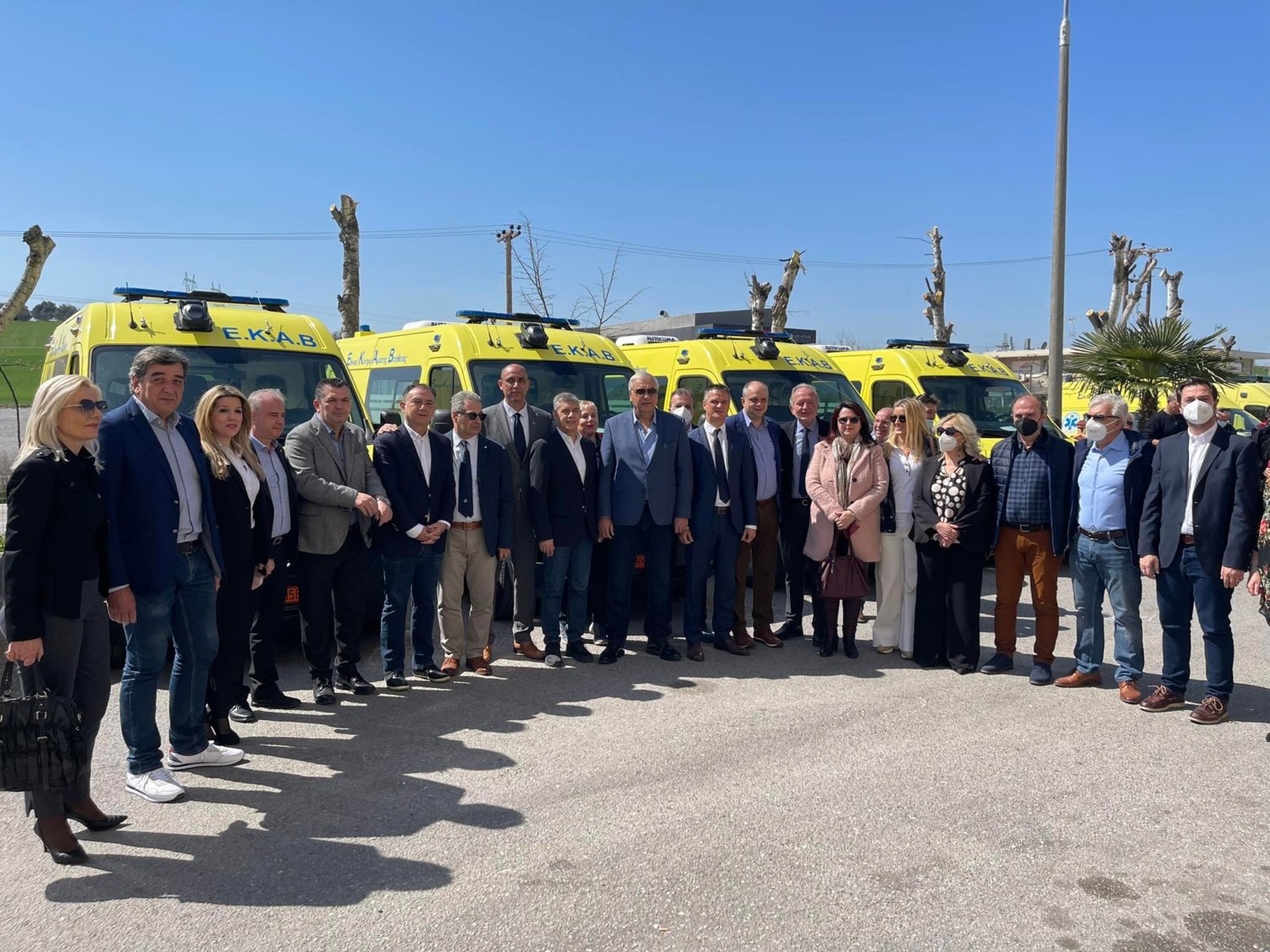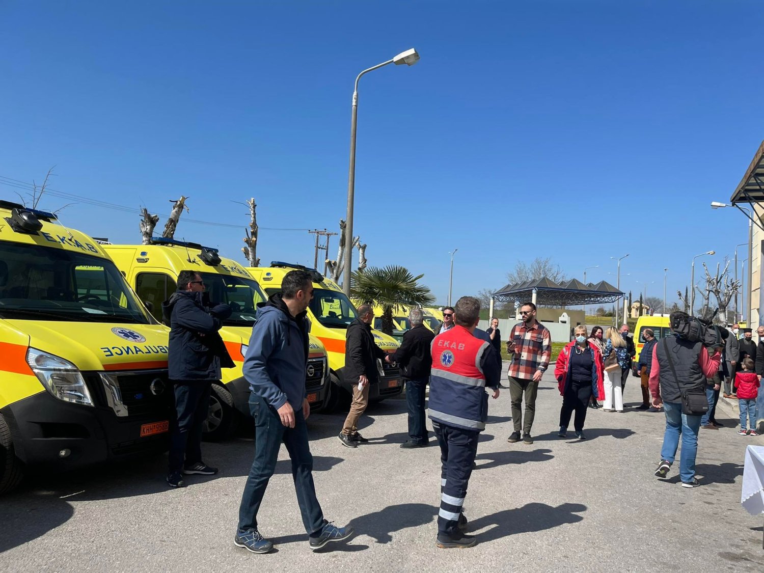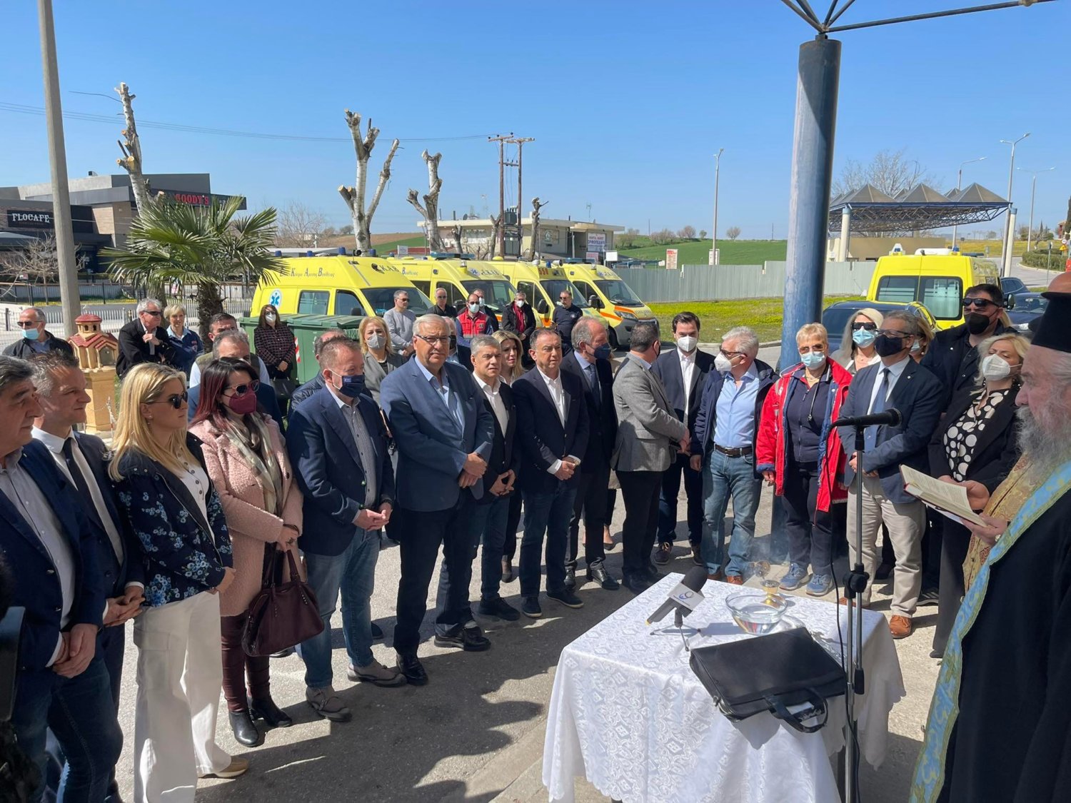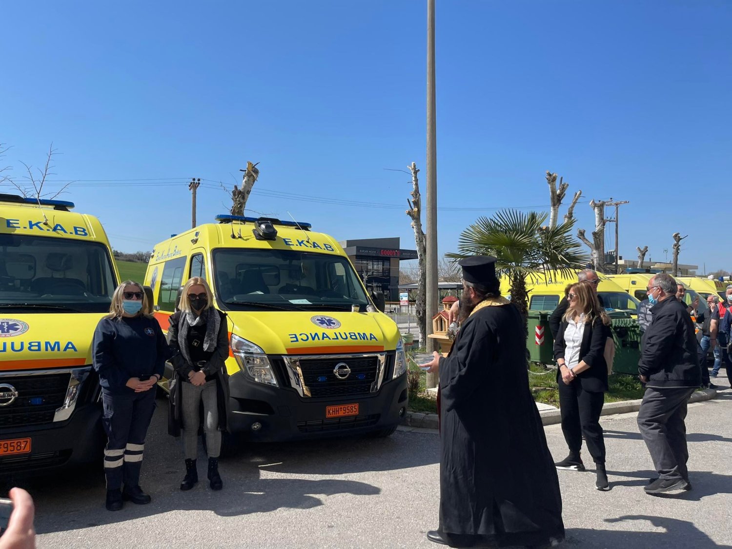 Με δέκα νέα ασθενοφόρα, τα οποία παραδόθηκαν σήμερα ενισχύεται το ΕΚΑΒ Θεσσαλίας. Στην εκδήλωση παραβρέθηκαν ο γενικός γραμματέας του υπ. Εσωτερικών Μιχάλης Σταυριανουδάκης, ο περιφερειάρχης Θεσσαλίας κ. Κώστας Αγοραστός, οι βουλευτές κκ. Χρήστος Κέλλας Χρήστος Μπουκώρος Θανάσης Λιούπης, και Βασίλης Κόκκαλης, η πρόεδρος του περιφερειακού συμβουλίου κα Τάνια Δόκου,ο αναπληρωτής Διοικητής της 5ης ΥΠΕ Ηλίας Τσιαούσης, ο Διοικητής του Πανεπιστημιακού Νοσοκομείου Λάρισας Δημήτρης Κατσικονούρης, ο Δήμαρχος Τεμπών Γιώργος Μανώλης, ο Αντιδήμαρχος του Δήμου Λαρισαίων Παναγιώτης Νταής, η επικεφαλής της μείζονος αντιπολίτευσης στο Δήμο Λαρισαίων Ρένα Καραλαριώτου, ο Πρόεδρος του Συλλόγου Εργαζομένων ΕΚΑΒ Θεσσαλίας Γιάννης Γούλας και στελέχη του ΕΚΑΒ Θεσσαλίας.