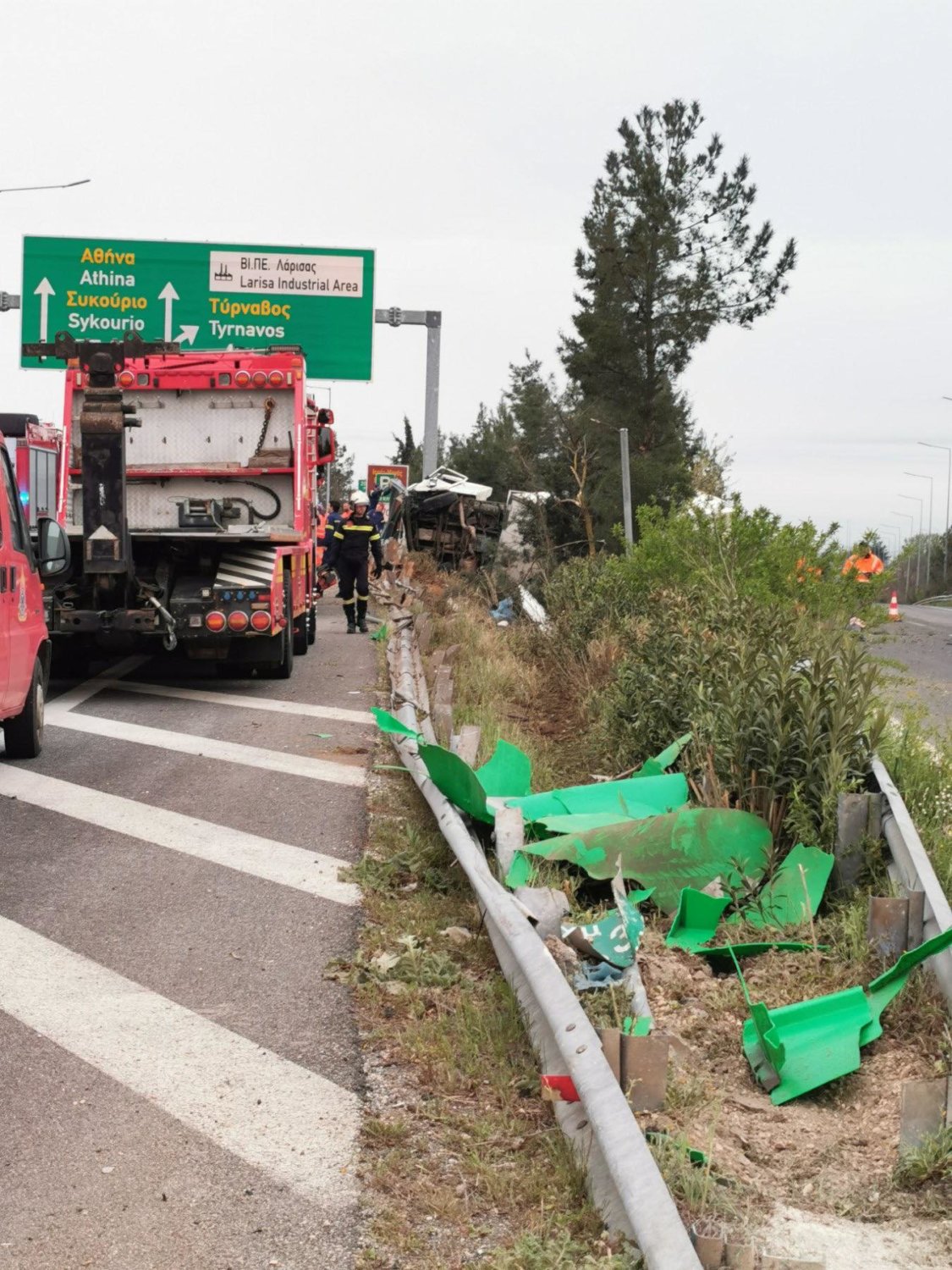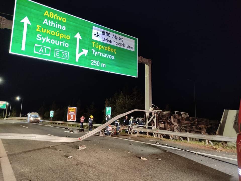 Όλα έγιναν όταν νταλίκα που κινούνταν στο ρεύμα προς Αθήνα – στο ύψος του κόμβου Γυρτώνης – υπό άγνωστες συνθήκες βγήκε εκτός πορείας με αποτέλεσμα να προσκρούσει σε μια κολόνα.