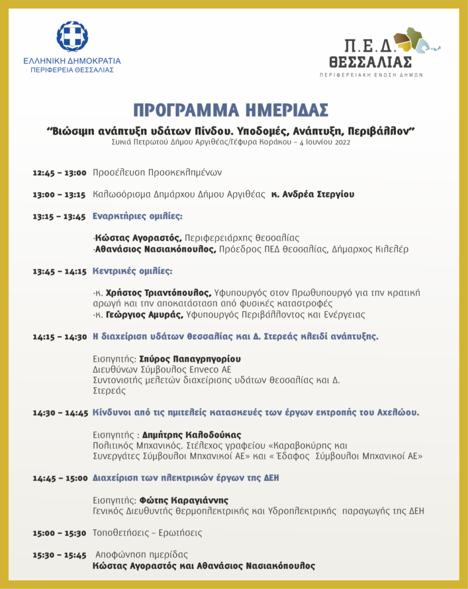 Με αφορμή την ημερίδα που διοργανώνει η Περιφέρεια και η ΠΕΔ Θεσσαλίας στις 4/6/2022, στη Συκιά Πετρωτού του Δήμου Αργιθέας με θέμα «Βιώσιμη ανάπτυξη υδάτων Πίνδου, Υποδομές, Ανάπτυξη, Περιβάλλον» και σε συνδυασμό με το γεγονός ότι ομιλητές θα είναι κυβερνητικά στελέχη, επικεφαλής της αυτοδιοίκησης της Θεσσαλίας, αλλά και έγκριτοι επιστήμονες – μελετητές ο Κώστας Γκούμας , γεωπόνος, πρ. Δ/ντής Εγγείων Βελτιώσεων, πρ. πρόεδρος ΓΕΩΤΕΕ/Κεντρικής Ελλάδας, μέλος Ε.Δ.Υ.ΘΕ απέστειλε επιστολή στην οποία διατυπώνει ορισμένα ερωτήματα στα οποία πρέπει να δοθούν απαντήσεις από τους συμμετέχοντες, προκειμένου να ενημερωθούν οι πολίτες της Θεσσαλίας για το πως θα αντιμετωπίσει στο μέλλον η Θεσσαλία τις επικείμενες κρίσεις (κλιματική, ενεργειακή, διατροφική) που απειλούν ευθέως την ασφάλεια και την ευημερία των πολιτών της: