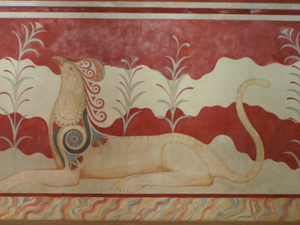 ΓΡΥΠΕΣ ΚΑΙ ΜΙΝΩΙΚΗ ΚΡΗΤΗ: Ο γρύπας είναι σύμβολο συνδεδεμένο με τη Μινωική Κρήτη. Υπάρχουν ευρήματα αρχαιολογικών ανασκαφών με τον Μινωικό άπτερο Γρύπα από την Ύστερη Εποχή του Χαλκού [1450 – 1400 π.Χ]. Δύο άπτεροι γρύπες απεικονίζονται δεξιά και αριστερά του θρόνου στην τοιχογραφία στην κύρια αίθουσα του θρόνου στο Μινωικό ανάκτορο. Οι γρύπες εμφανίζονται άπτεροι, για να δηλώσουν την συνεχή παρουσία τους στον χώρο της αίθουσας του θρόνου. Η μικτή μορφή του άπτερου γρύπα εξέφραζε τη μινωική κοσμοθεωρία για τις τρεις σφαίρες του κόσμου, ουράνια, επίγεια και υποχθόνια, με το αετίσιο κεφάλι, το λιονταρίσιο σώμα και την φιδίσια ουρά, αντιστοίχως. Ένα δεύτερο δείγμα είναι από το σφραγιστικό δακτυλίδι με παράσταση θεάς και γρύπα [1450 – 1400 π.Χ]. Το μεγαλύτερο μέρος καταλαμβάνει ένας γρύπας, που παριστάνεται σε «ιπτάμενο καλπασμό» να εκτινάσσεται προς τα επάνω, με ανοιγμένα τα φτερά του. Το σώμα του είναι λεπτό και ανάλαφρο, ενώ το κεφάλι του τονίζεται με το μακρύ, γαμψό ράμφος.