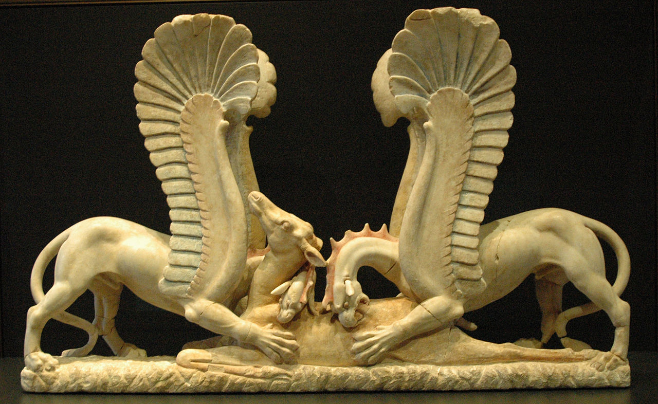 ΓΕΝΙΚΑ – ΠΕΡΙΓΡΑΦΗ: Ο Γρύπας ήταν μια ορνιθομορφική απεικόνιση κοινή στην Μυθολογία των Ελλήνων αλλά και στις παραδόσεις ευρασιατικών αρχαίων πληθυσμών. Είχε σώμα λέοντος και κεφάλι και φτερά αετού. Σε μερικές παραστάσεις του φαίνεται πως έχει και ουρά φιδιού. Ο μύθος του προέρχεται από τη Μεσοποταμία, όπου και θεωρείτο δαίμονας. Ίσως η γέννηση του μύθου να ανάγεται στην εποχή της πρώτης ανακάλυψης οστών δεινοσαύρων από τον προϊστορικό άνθρωπο. Κάποιο αρχαιολόγοι διατείνονται πως αυτό συνέβη μετά την ανεύρεση απολιθωμένων υπολείμματων πρωτοκεράτοπα σε ορυχεία χρυσού στα βουνά Αλτάια της αρχαίας Σκυθίας, στο σημερινό νοτιοανατολικό Καζακστάν. Η ράχη του ήταν σκεπασμένη με φτερά και τα νύχια στα λιονταρίσια πόδια του ήταν δυνατά και γαμψά σαν του αετού. Τα νύχια του γρύπα θεωρούνταν πολύτιμα(!) το Μεσαίωνα από αλχημιστές και άλλους πρακτικούς “γιατρούς” επειδή λεγόταν ότι μπορούσαν να ανιχνεύσουν την ύπαρξη δηλητηρίου στα υγρά!