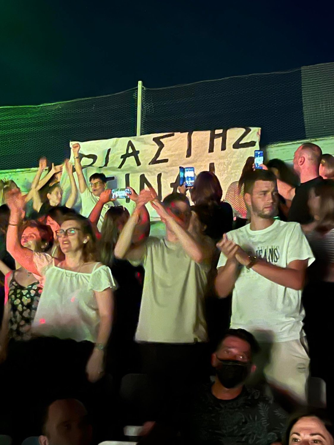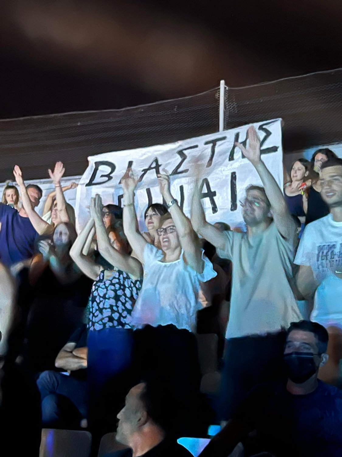 Αυτή τη φορά, πολίτες που παρακολούθησαν τη συναυλία του Σωκράτη Μάλαμα χθες Τετάρτη στο Κηποθέατρο Αλκαζάρ, σήκωσαν πανό στο οποίο αναγραφόταν «Βιαστής είναι».