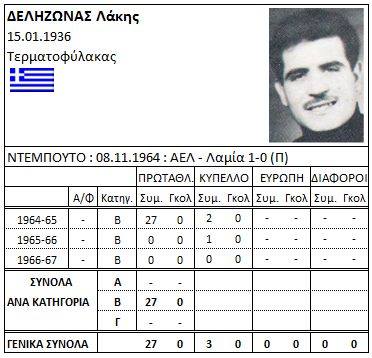 Ο Λάκης Δεληζώνας προερχόταν από την ομάδα του Λαρισαϊκού με την οποία διέπρεψε και με τη συγχώνευση του 1964 επιλέχθηκε ως ο βασικός τερματοφύλακας της ΑΕΛ στη Β Εθνική.