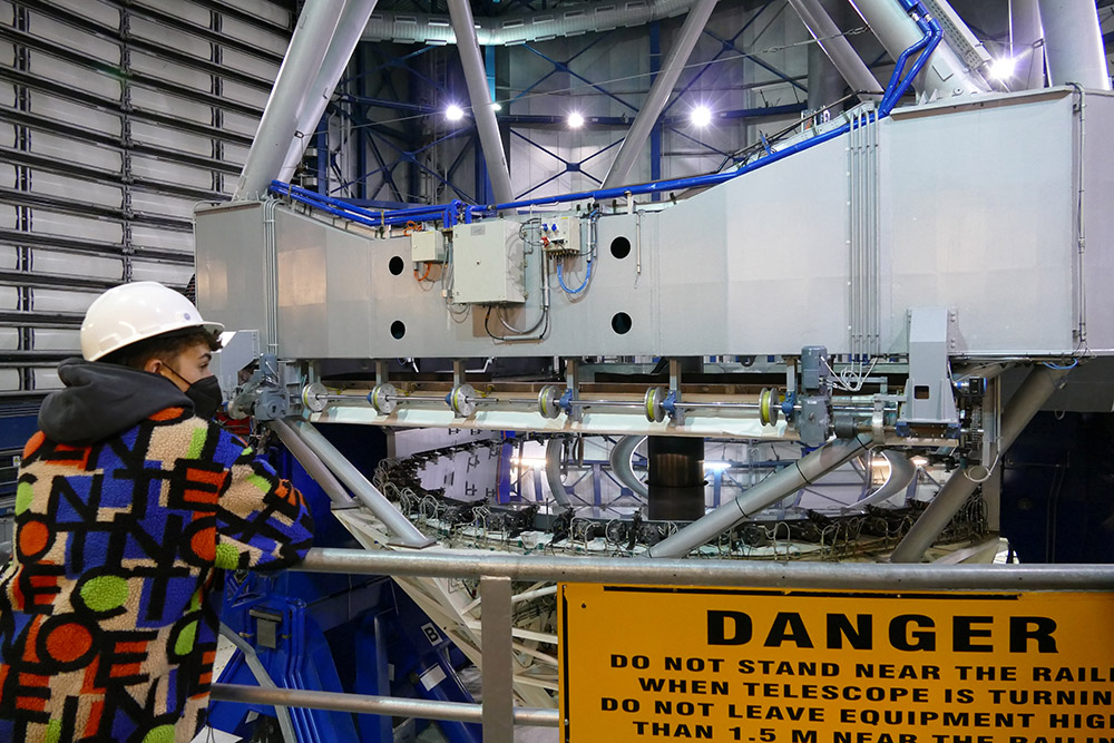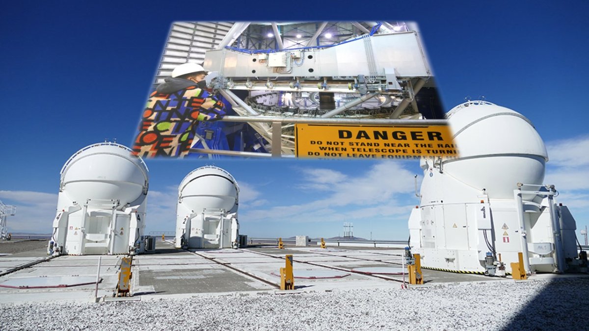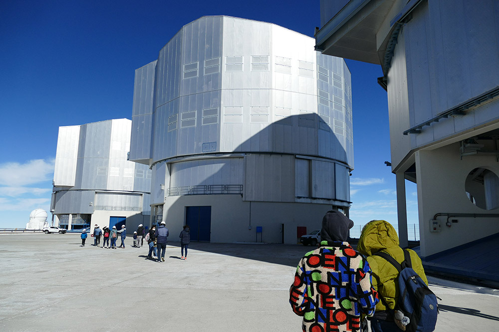 …Τέλος πάνω στο πλάτωμα που βρισκόμαστε υπάρχει ένα ακόμα τηλεσκόπιο, το μεγαλύτερο στο είδος του στον κόσμο, το οποίο παρέχει τη δυνατότητα ομοιόμορφης παρατήρησης μεγάλων τμημάτων του ουρανού. Μπαίνουμε σε ένα από τα 4 πολύ μεγάλα τηλεσκόπια των 8,2 μέτρων. Η Μακαρένα μας εξηγεί τη λειτουργία του. Η επιφάνεια του καθρέπτη έχει μία λεπτή στρώση αλουμινίου και καθαρίζεται κάθε 1,5 χρόνο, με ειδικό αφρό. ενώ υπάρχει και η δυνατότητα να μεταφερθεί σε άλλο χώρο και να επιδιορθωθεί, αν υπάρχει λόγος. Το τηλεσκόπιο φυσικά δεν εργάζεται αυτή τη στιγμή, αφού είναι ημέρα. Η εργασία του ξεκινάει όταν νυχτώνει και τελειώνει λίγο πριν ξημερώσει».