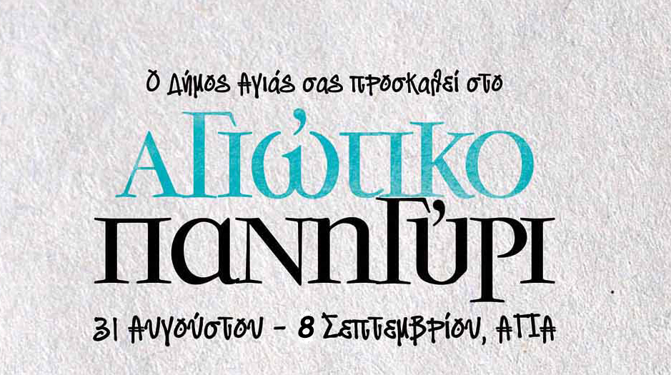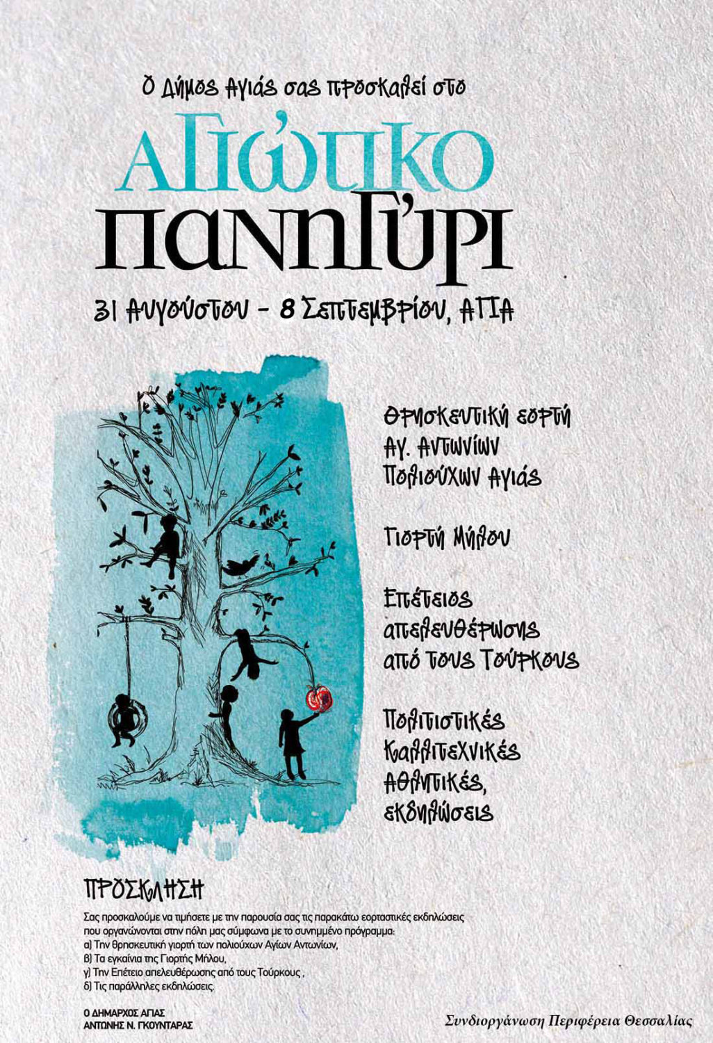 Ο Δήμος Αγιάς και η Κοινωφελής Επιχείρηση «ΚΑΛΥΨΩ», μετά από 2 χρόνια απουσίας λόγω πανδημίας, σας προσκαλούν στην πόλη της Αγιάς, προκειμένου να παρακολουθήσετε τις πλούσιες εορταστικές εκδηλώσεις του Αγιώτικου Πανηγυριού και της 25ης Γιορτής Μήλου, οι οποίες θα πραγματοποιηθούν από την Τετάρτη 31 Αυγούστου 2022 έως και την Παρασκευή 8 Σεπτεμβρίου 2022.