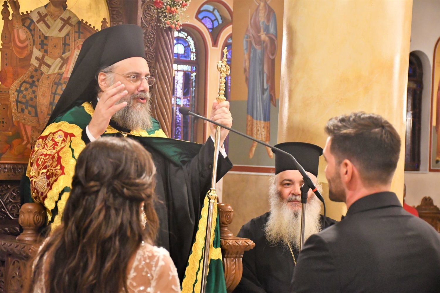 Ο Μητροπολίτης Τρίκκης κ. Χρυσόστομος, αφού ευλόγησε τους νεονύμφους ενώπιον του πολυπληθούς εκκλησιάσματος στη συνέχεια τους προσέφερε μία εικόνα της Παναγίας Ελευθερώτριας, ευχόμενος παράλληλα ο Τίμιος Σταύρος να προπορεύεται στη ζωή τους.