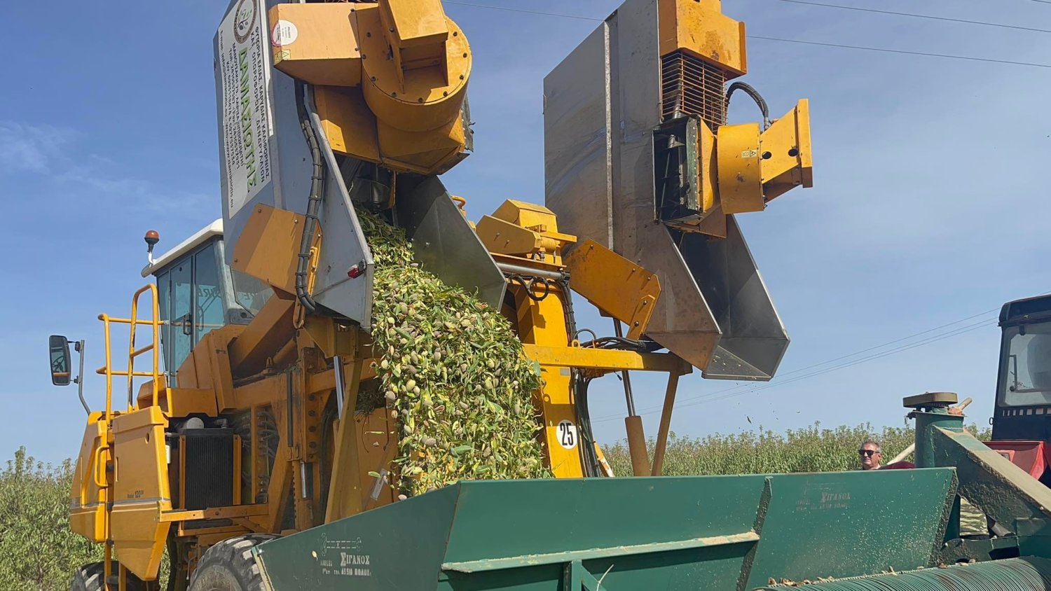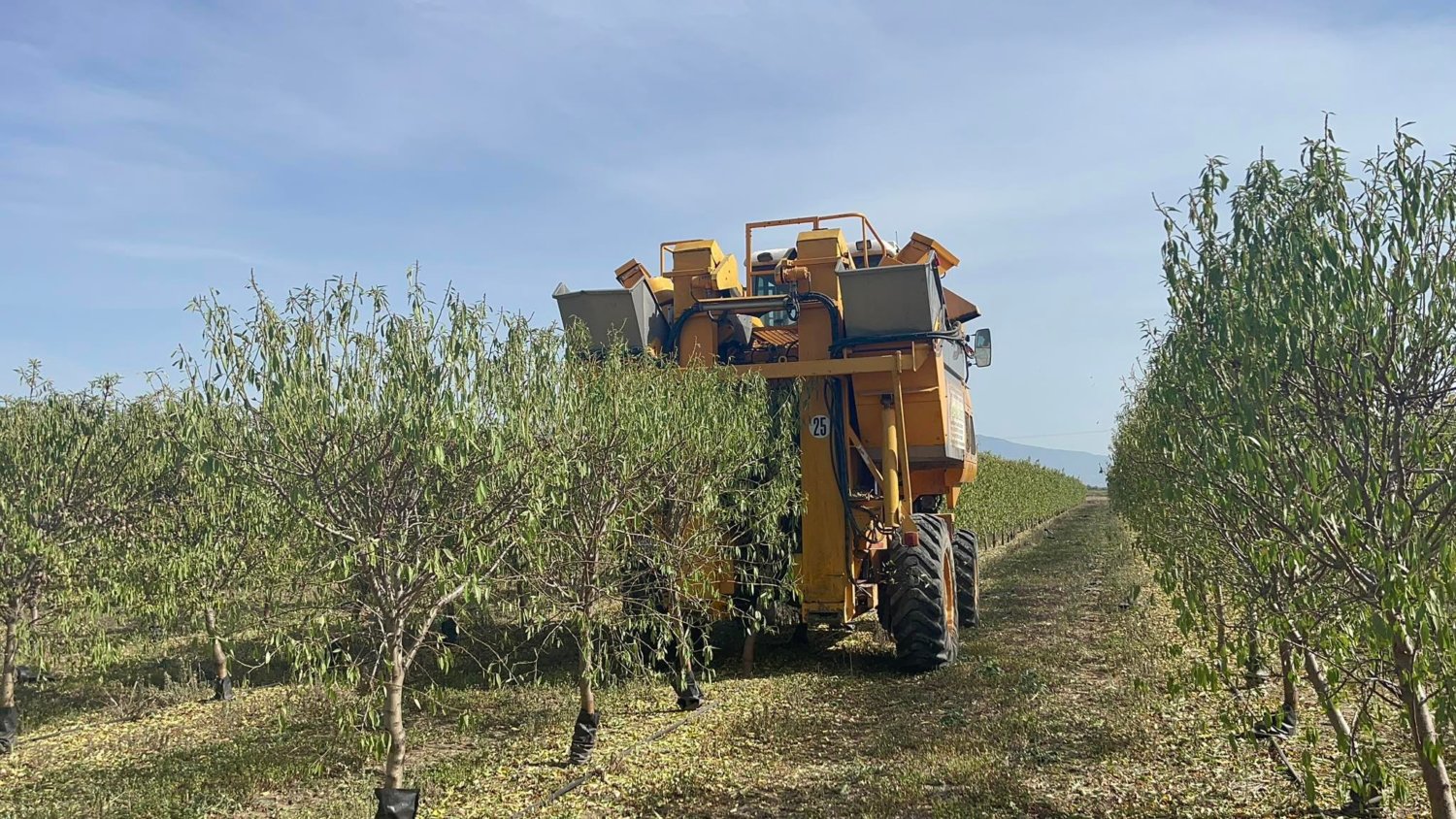 Δείτε πως γίνεται η μηχανική συγκομιδή αμυγδαλιάς πυκνής φύτευσης και η διαδικασία αποφλοίωσης των αμυγδάλων: