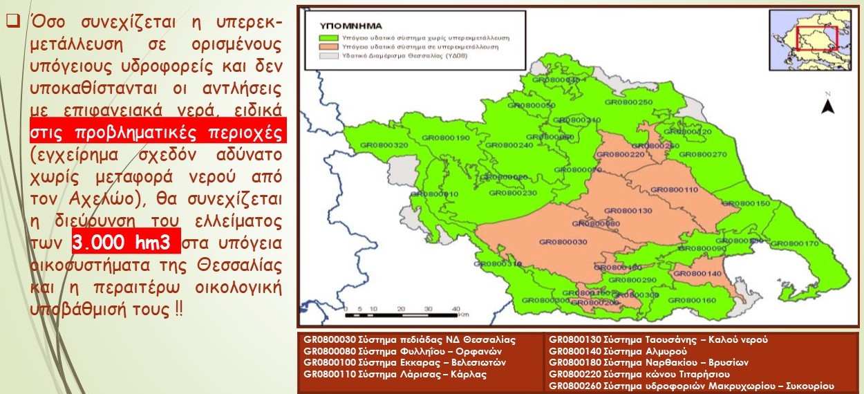 Θα σημειώσουμε επίσης πως παρότι είναι γνωστό πώς τα νερά του Αχελώου (εάν μεταφερθούν) αλλάζουν καθοριστικά τα διαθέσιμα του ΥΔ/Θ σε όλα τα επίπεδα (αποθέματα ασφάλειας, αρδεύσεις, οικολογική αποκατάσταση υπόγειων υδροφορέων κλπ.), φαίνεται ότι αυτή η απαράδεκτη τεχνητή εκκρεμότητα των έργων εξυπηρετεί αμφότερες τις ηγεσίες των δυο μεγάλων κομμάτων που διεκδικούν της εξουσία.