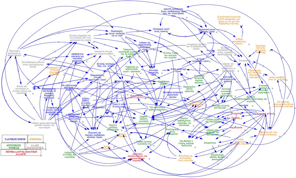 Φανταστείτε τώρα λοιπόν στο επίπεδο του φυσικού περιβάλλοντος ότι το NEXUS είναι ένα πολύπλοκο σύστημα το οποίο συντίθεται από μια σειρά τομέων. Εμείς εστιάζουμε την προσοχή μας σε τέσσερις κρίσιμους τομείς: το νερό, την ενέργεια, το περιβάλλον και τη γεωργία. Όλα αυτά συνθέτουν το NEXUS της λεκάνης απορροής του Πηνειού. Για να μπορέσουμε να το διαχειριστούμε αυτό το NEXUS οφείλουμε να δούμε πώς όλοι αυτοί οι τομείς μπορούν να συνδιαχειριστούν λαμβάνοντας υπόψη ο ένας τις ανάγκες του άλλου ώστε να φτάσουμε σε μια βιώσιμη κατάσταση. Και αυτό πρέπει να γίνει γιατί οι τέσσερις τομείς αλληλοεξαρτώνται μεταξύ τους. Για παράδειγμα αν εγώ τραβήξω όλο το νερό για να ποτίσω την καλλιέργεια μου δεν θα έχει να πάει νερό στη θάλασσα ώστε να διατηρηθούν ενδεχομένως κάποιες ιχθυοκαλλιέργειες εκεί. Όλα πρέπει να δεχθούν διαχείριση κάτω από ένα περιβάλλον ολιστικό γιατί οι φυσικοί πόροι είναι περιορισμένοι και τους χρειάζονται όλοι οι τομείς.