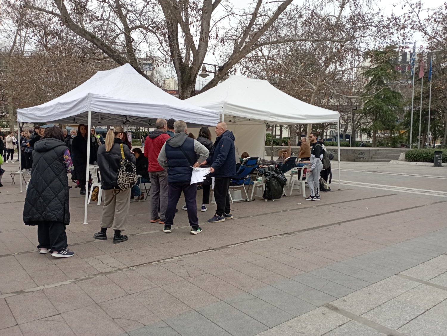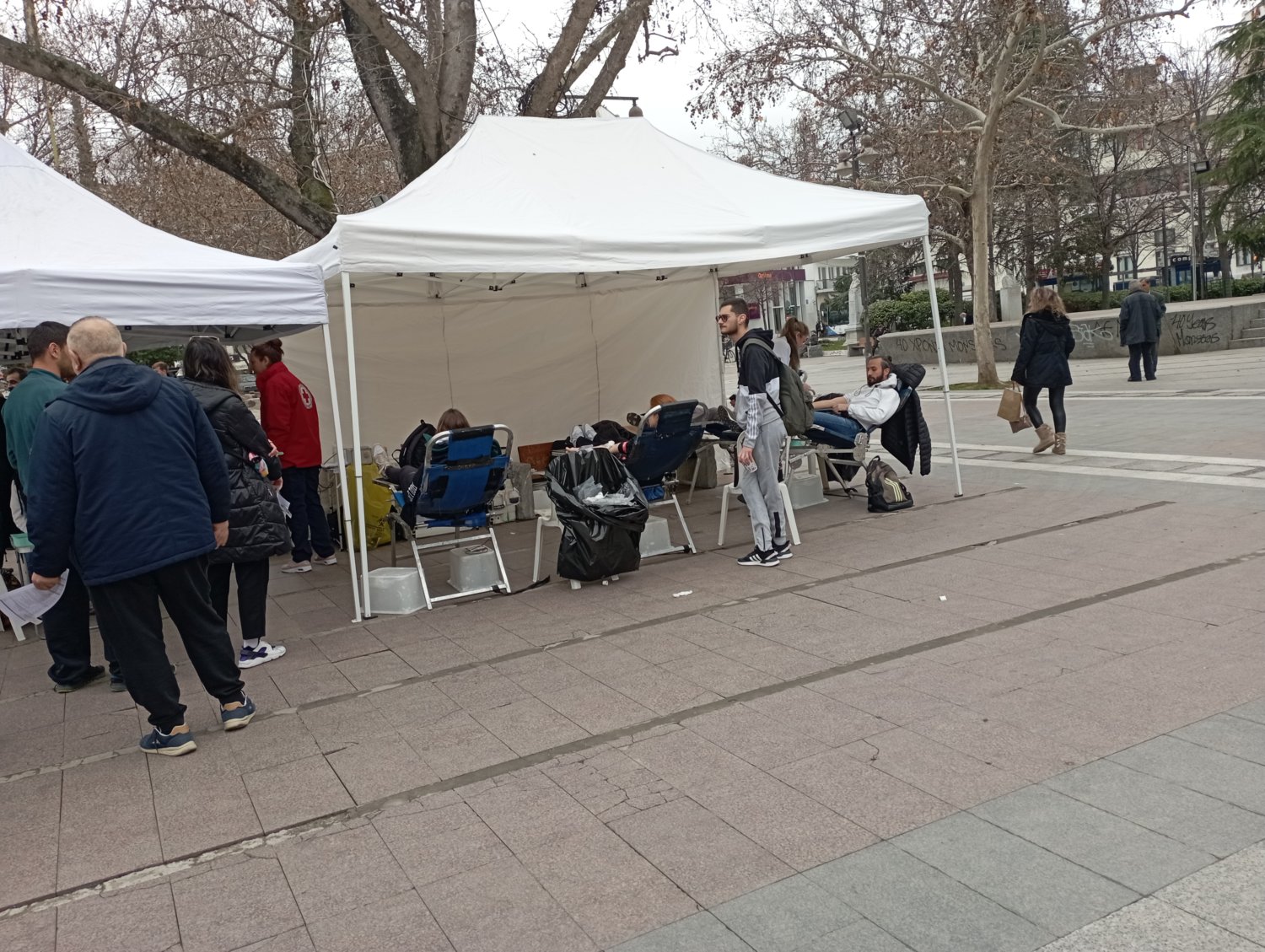 Μεγάλη είναι η ανταπόκριση των Λαρισαίων στην εθελοντική αιμοδοσία που πραγματοποιείται από τα δύο νοσοκομεία της Λάρισας και τον Ερυθρό Σταυρό στην κεντρική πλατεία της Λάρισας για την κάλυψη των αναγκών εξαιτίας του δυστυχήματος στα Τέμπη.