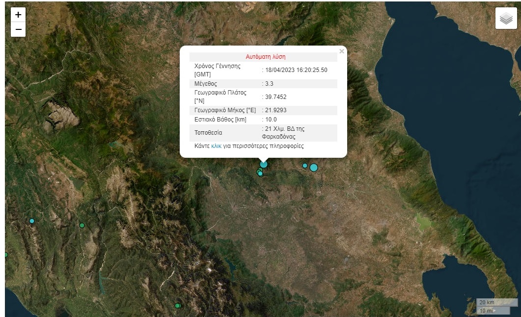 Σύμφωνα με την αυτόματη λύση του γεωδυναμικού Ινστιτούτου η σεισμική δόνηση καταγράφηκε 21 χιλιόμετρα ΒΔ της Φαρκαδόνας