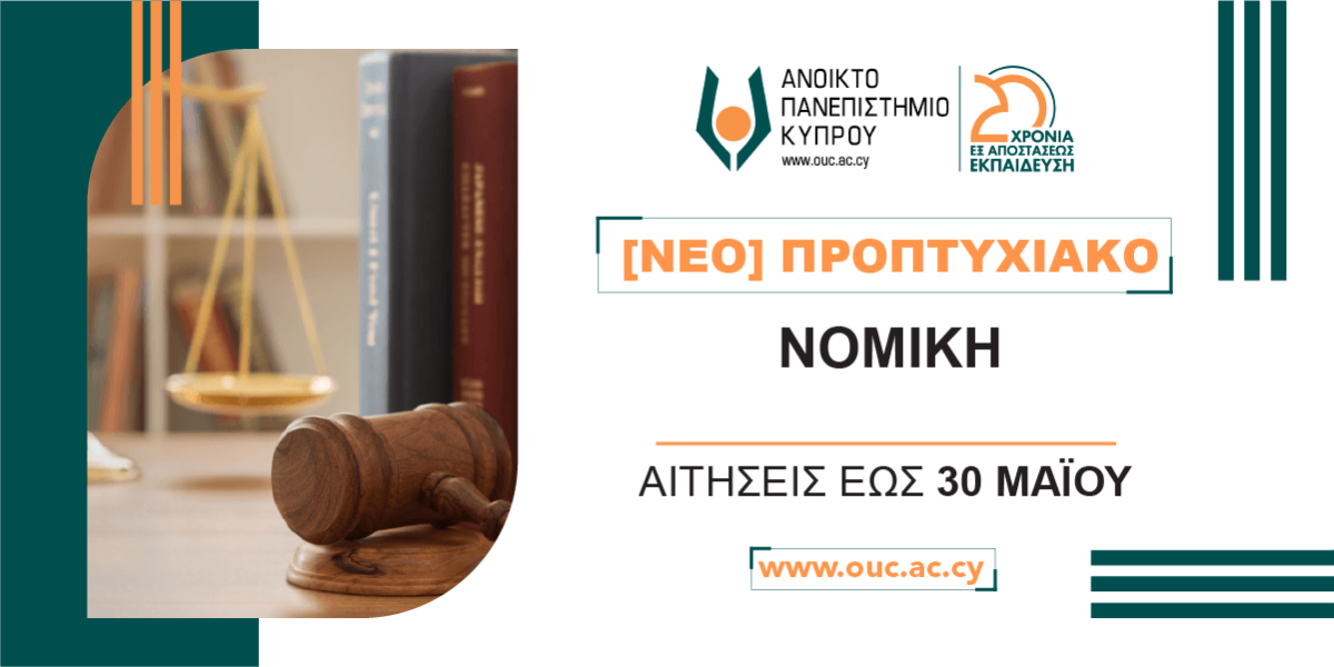 Το νέο Προπτυχιακό Πρόγραμμα (ΒΑ) στη Νομική εξ αποστάσεως του Ανοικτού Πανεπιστημίου Κύπρου (ΑΠΚΥ) προσφέρεται για πρώτη φορά από το ακαδημαϊκό έτος 2023/24 και έχει γλώσσα διδασκαλίας την ελληνική. Το Πτυχίο Νομικής του ΑΠΚΥ είναι πιστοποιημένο από τον Φορέα Διασφάλισης και Πιστοποίησης της Ποιότητας της Ανώτερης Εκπαίδευσης (ΔΙΠΑΕ) και καλύπτει τα μαθήματα των εξετάσεων του Νομικού Συμβουλίου για ασκούμενους δικηγόρους.