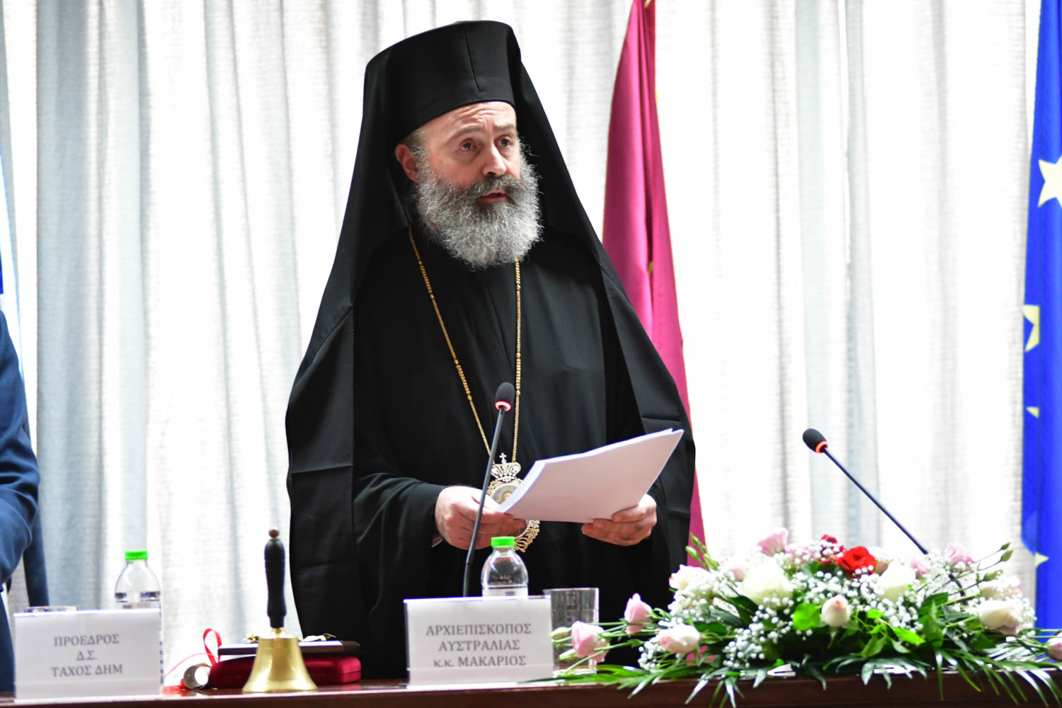 Ο σημαντικός φιλοξενούμενος μας, Αρχιεπίσκοπος Αυστραλίας, υπέρτιμος και έξαρχος πάσης Ωκεανίας κ.κ. Μακάριος, συγκαταλέγεται μεταξύ των πλέον διακεκριμένων ιεραρχών, όχι μόνο λόγω της εξαίρετης διακονίας του στην Αρχιεπισκοπή Αυστραλίας, εκεί που ο Ελληνισμός ακμάζει, αλλά και λόγω της εξέχουσας προσωπικότητας του, που σφυρηλατήθηκε μέσω των λαμπρών του σπουδών και της αξιοζήλευτης πορείας του στους κόλπους του Οικουμενικού Πατριαρχείου, μιας πορείας που τον οδήγησε στο θρόνο της Αρχιεπισκοπής Αυστραλίας και Πάσης Ωκεανίας. Γεννημένος στο Ηράκλειο τής Κρήτης το 1973, ολοκλήρωσε τις εγκύκλιες σπουδές του στην γενέτειρα του και έλαβε τα πτυχία της Ανωτέρας Εκκλησιαστικής Αθηνών και της Θεολογικής Σχολής του ΕΚΠΑ Αθήνας.