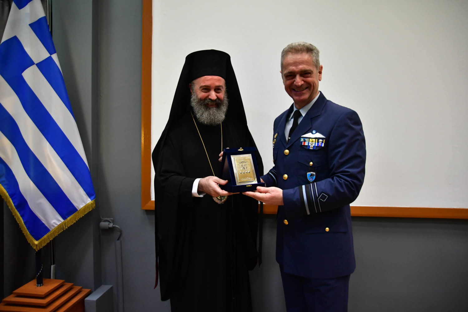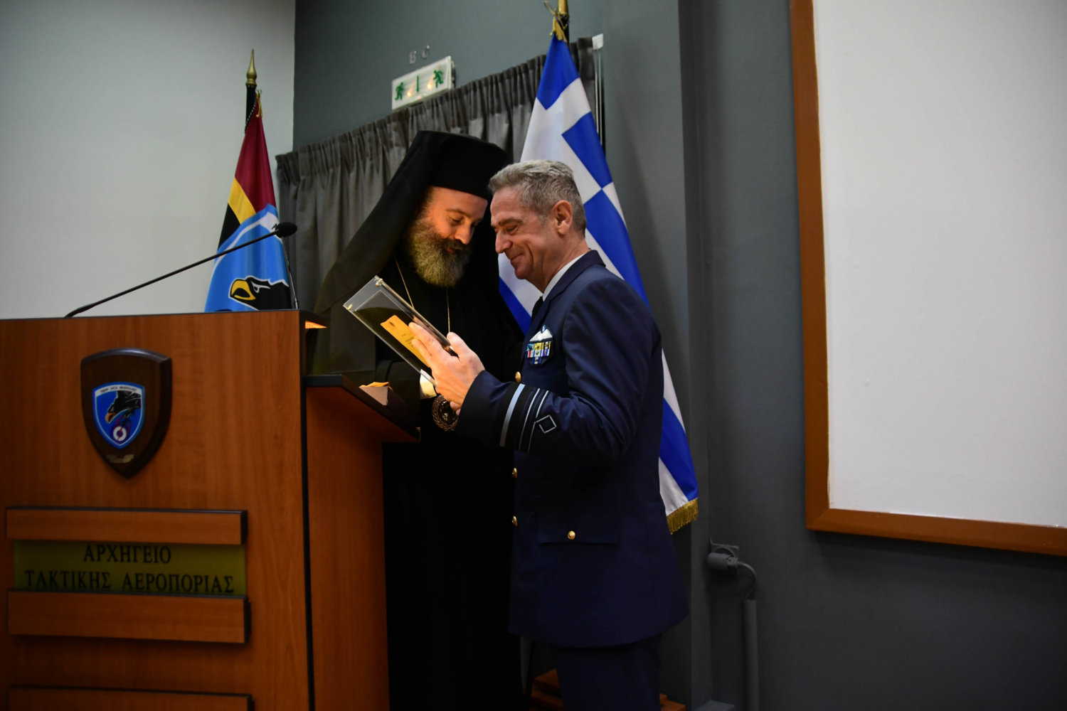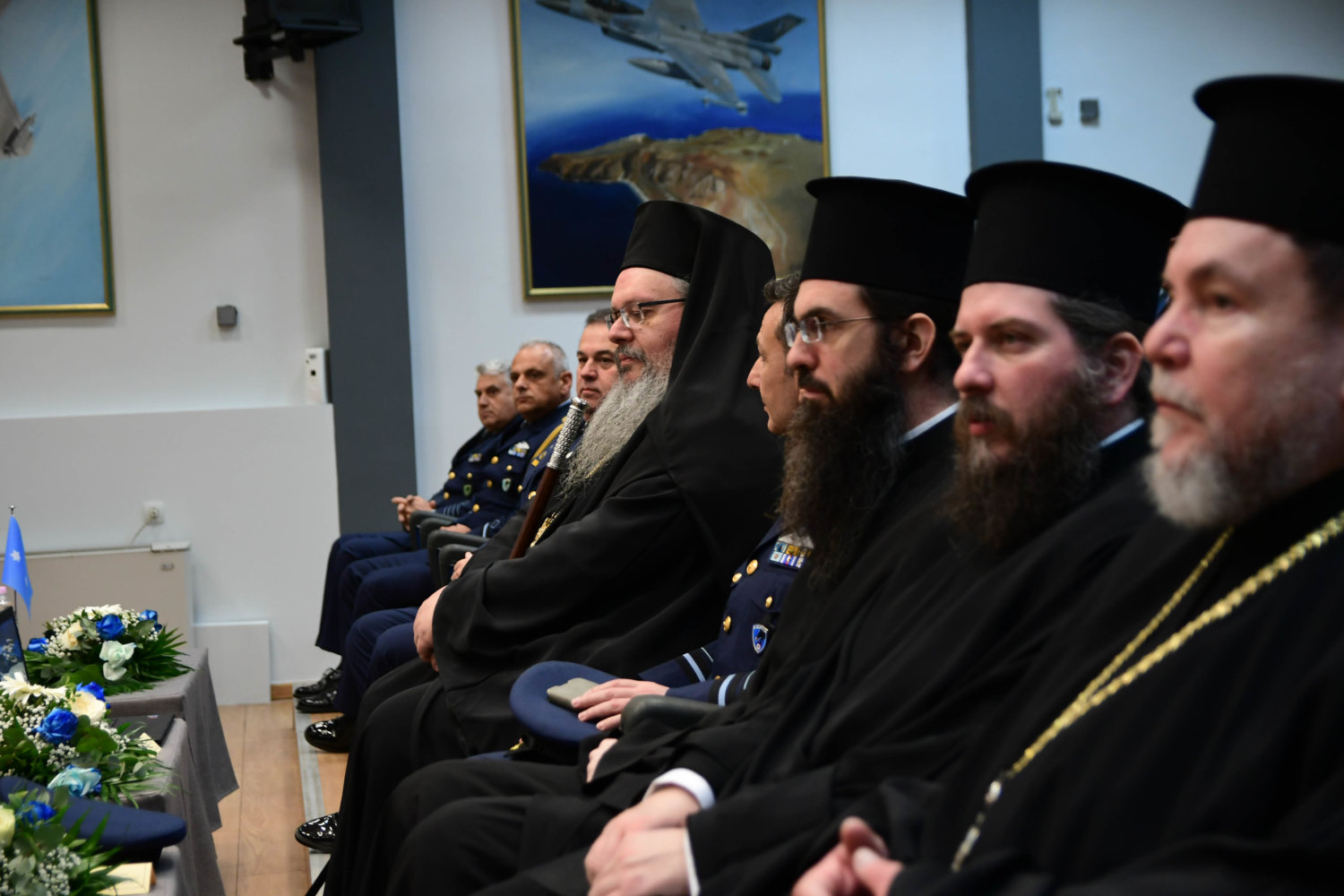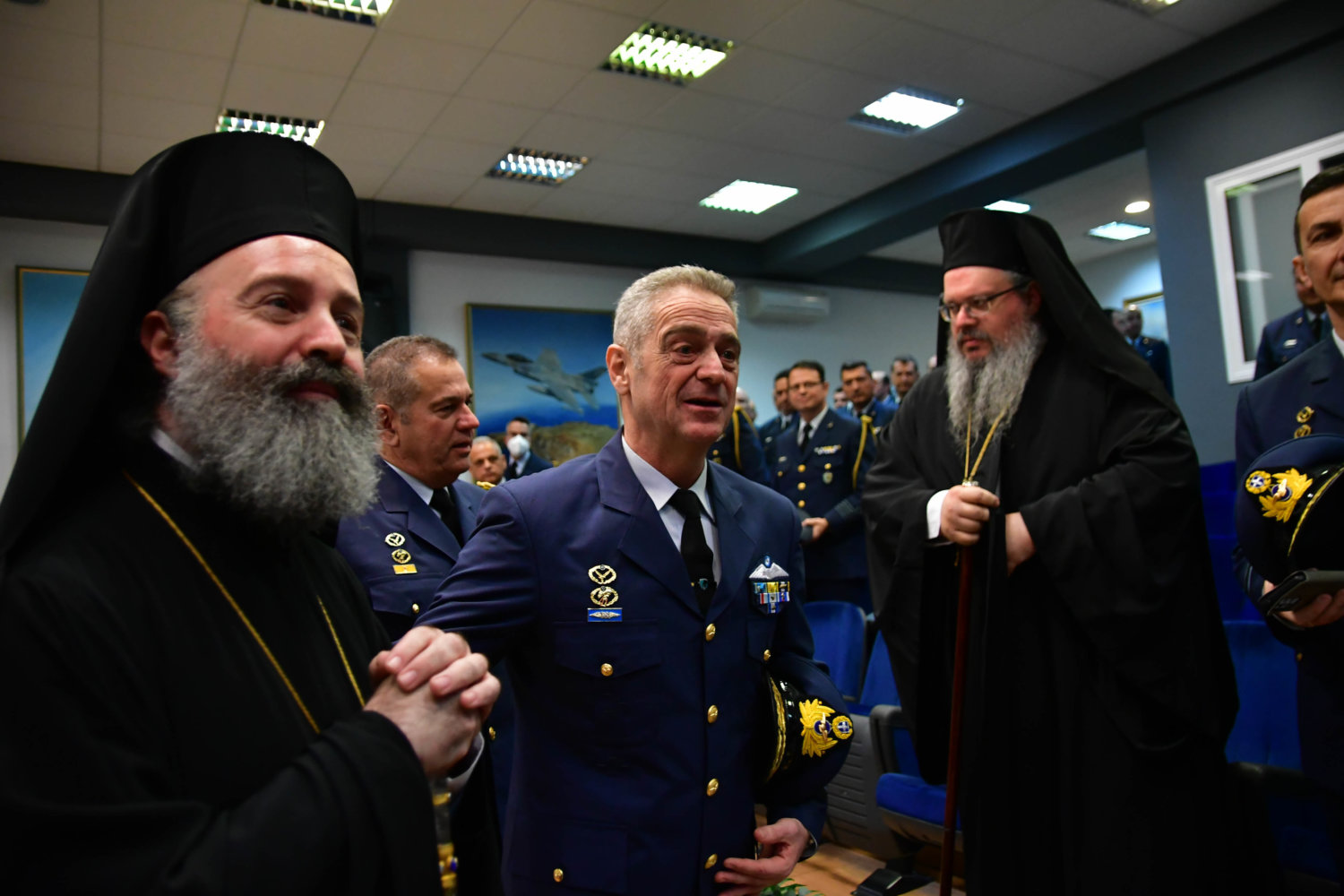 Τον Αρχιεπίσκοπο υποδέχθηκε ο Αρχηγός Τακτικής Αεροπορίας Γ. Φασούλας, ενώ στη συνέχεια ακολούθησε παρουσίαση των Ανώτατων Αξιωματικών και ενημέρωση για την αποστολή του Αρχηγείου.