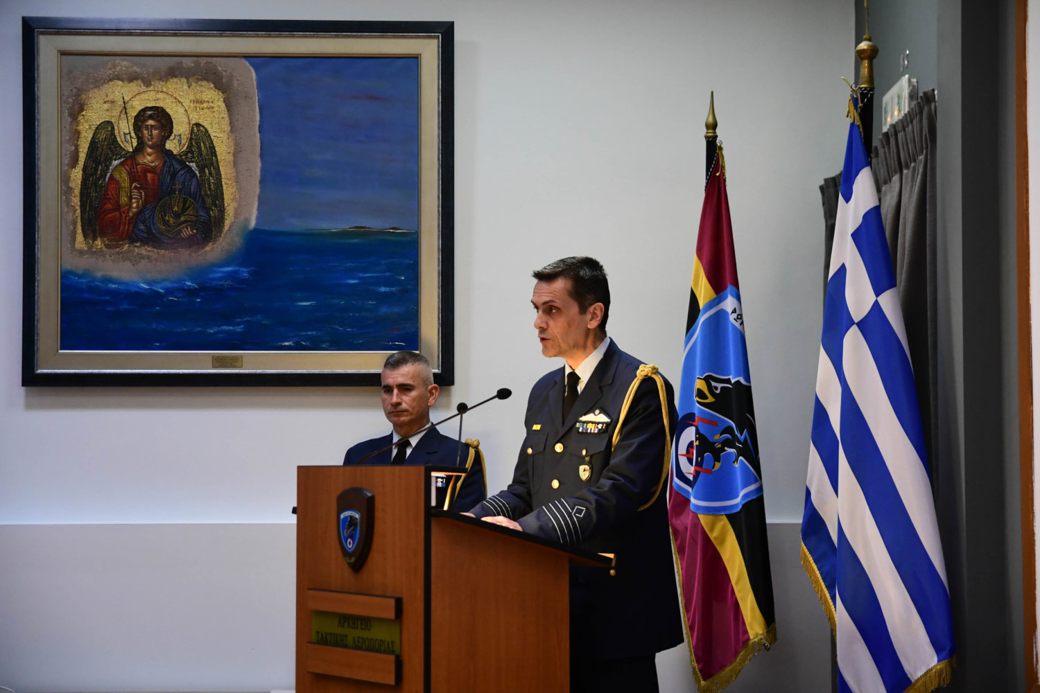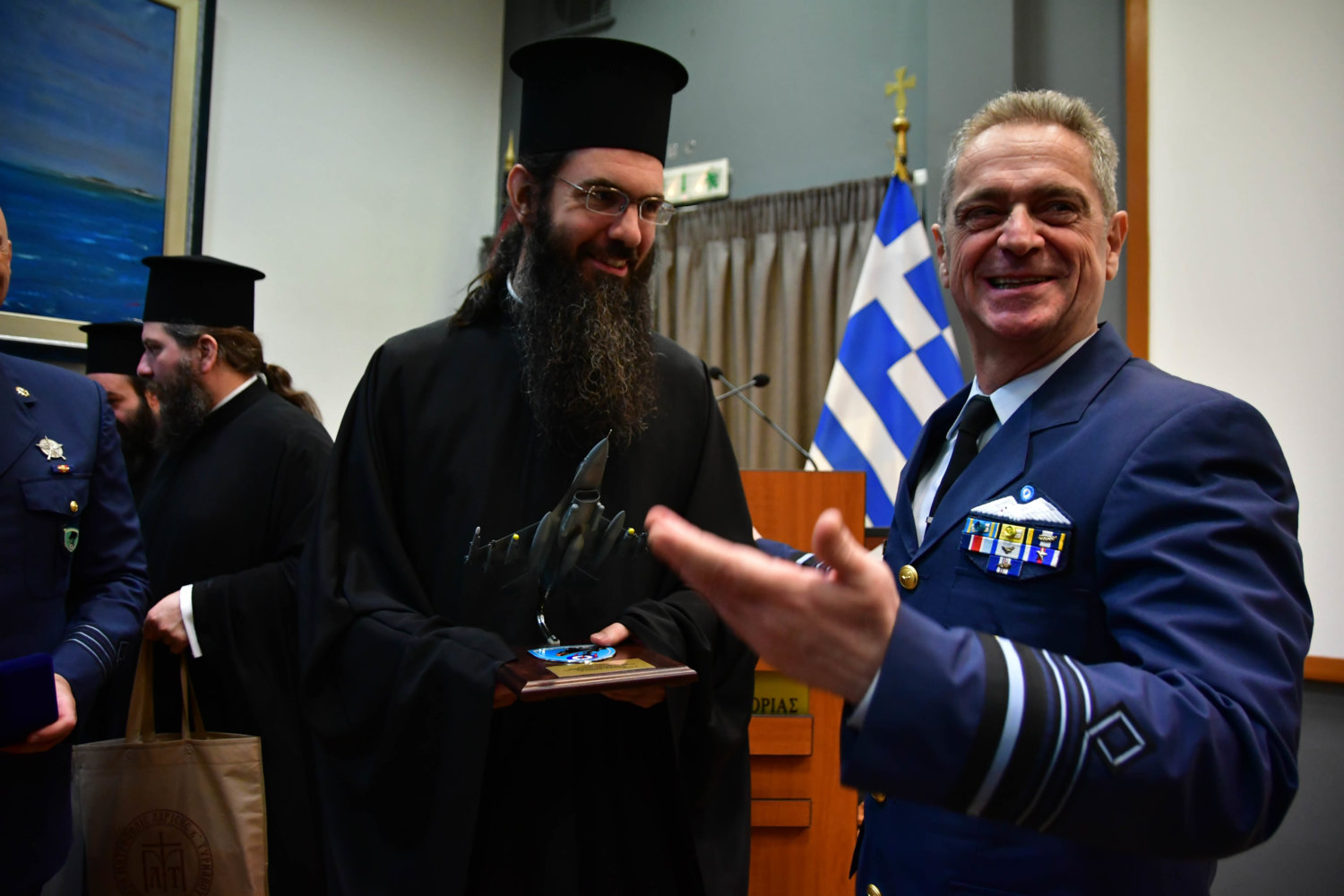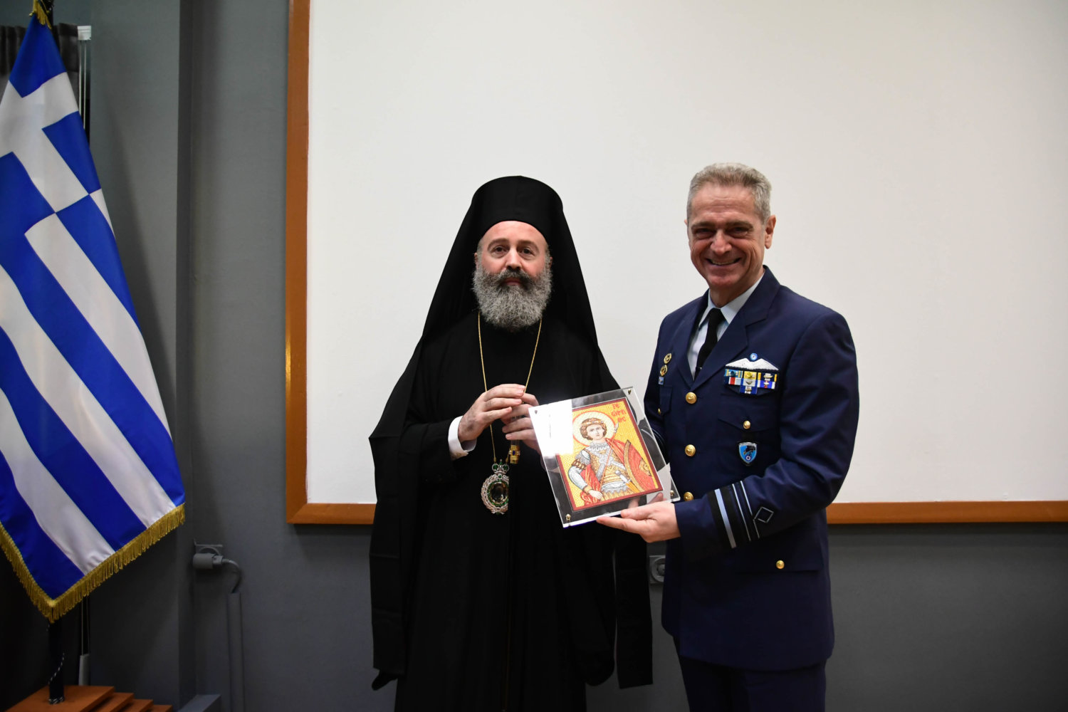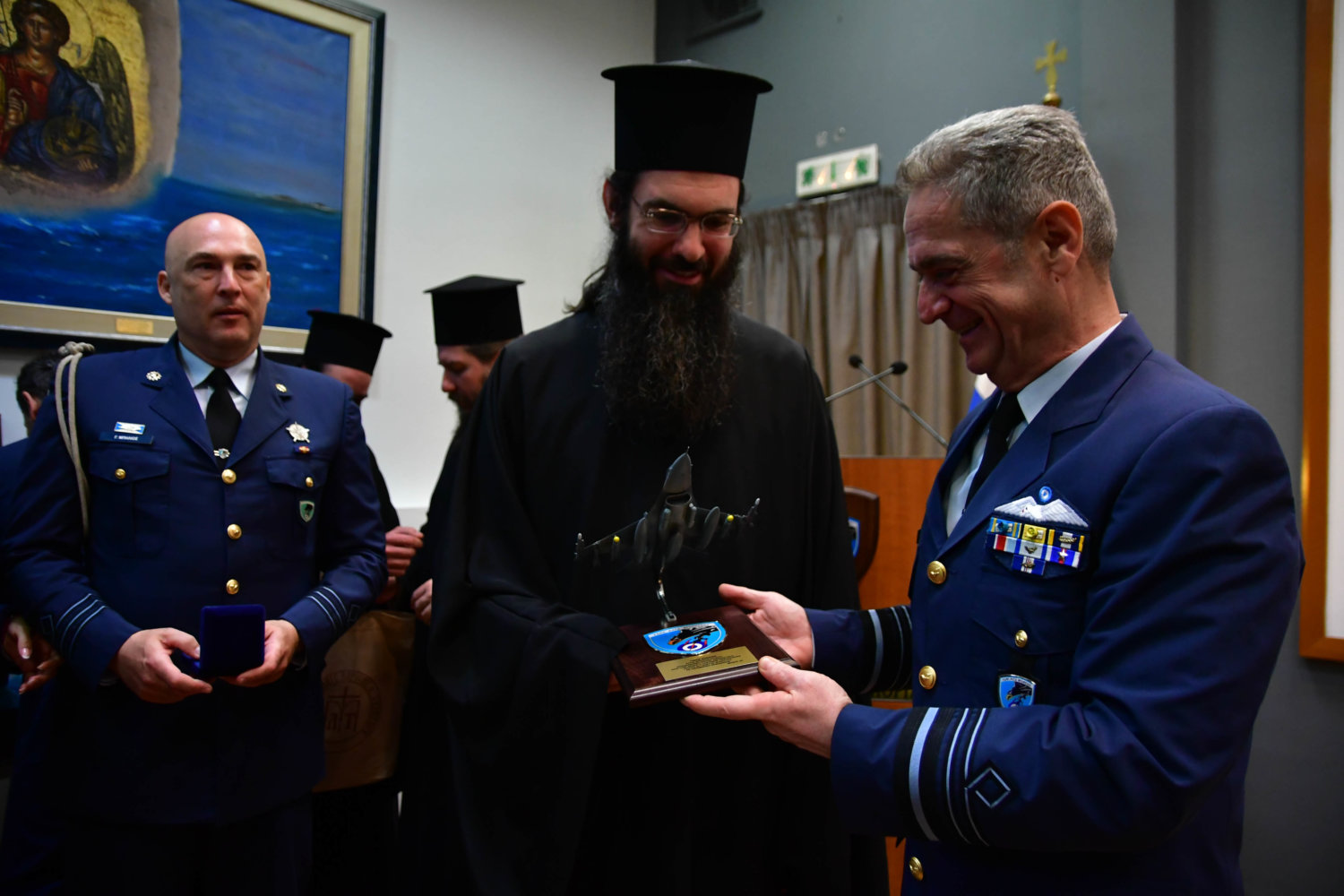 Τον Αρχιεπίσκοπο υποδέχθηκε ο Αρχηγός Τακτικής Αεροπορίας Γ. Φασούλας, ενώ στη συνέχεια ακολούθησε παρουσίαση των Ανώτατων Αξιωματικών και ενημέρωση για την αποστολή του Αρχηγείου.