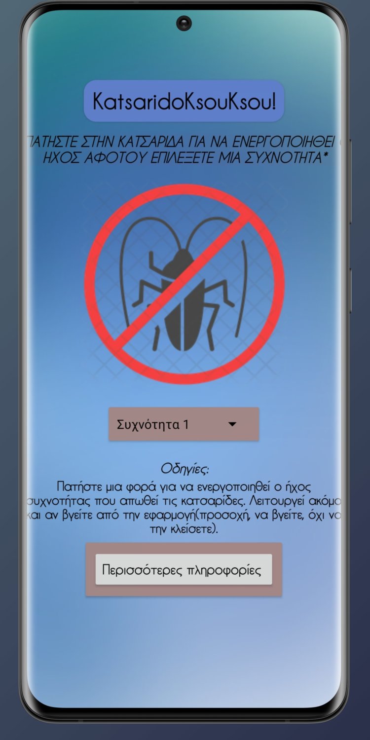 Το Ksou Ksou & KatsaridoKsouKsou αποτελεί τις πρώτες Ελληνικές δωρεάν εφαρμογές κινητών οι οποίες σου δίνουν την δυνατότητα να απωθήσεις οποιοδήποτε κουνούπι & κατσαρίδα γύρω σου με το πάτημα ενός κουμπιού. Μήπως όταν εμφανίζονται τα κουνούπια & οι κατσαρίδες κάθε βράδυ στην αυλή ή το μπαλκόνι σου, τότε εξαφανίζεστε εσείς; Αν δεν θες να υποφέρεις άλλο από «απρόσκλητους επισκέπτες», πάτα το κουμπάκι και διώξτους μακριά! Πίστεψε με εσύ δεν θα καταλάβεις τίποτα. ΑΥΤΑ ΟΜΩΣ ΘΑ ΕΞΑΦΑΝΙΣΤΟΥΝ!…