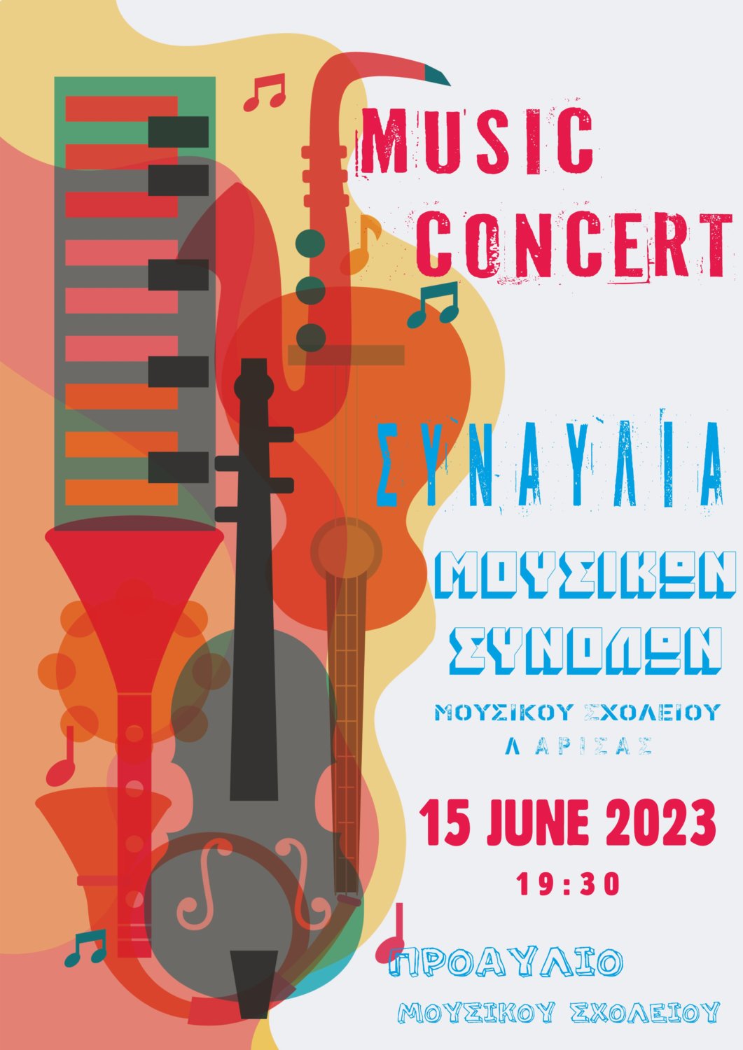 Την Πέμπτη, 15 Ιουνίου 2023 και ώρα 19.30, θα πραγματοποιηθεί στο προαύλιο του Μουσικού Σχολείου Λάρισας η καθιερωμένη ετήσια συναυλία των Μουσικών του Συνόλων. Το πρόγραμμα αποτελεί ένα ευχάριστο μουσικό ταξίδι από μουσικές και δράσεις από τα Μουσικά Σύνολα του Σχολείου.