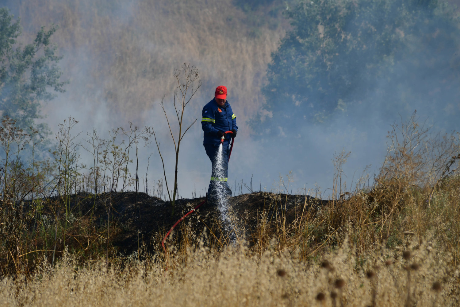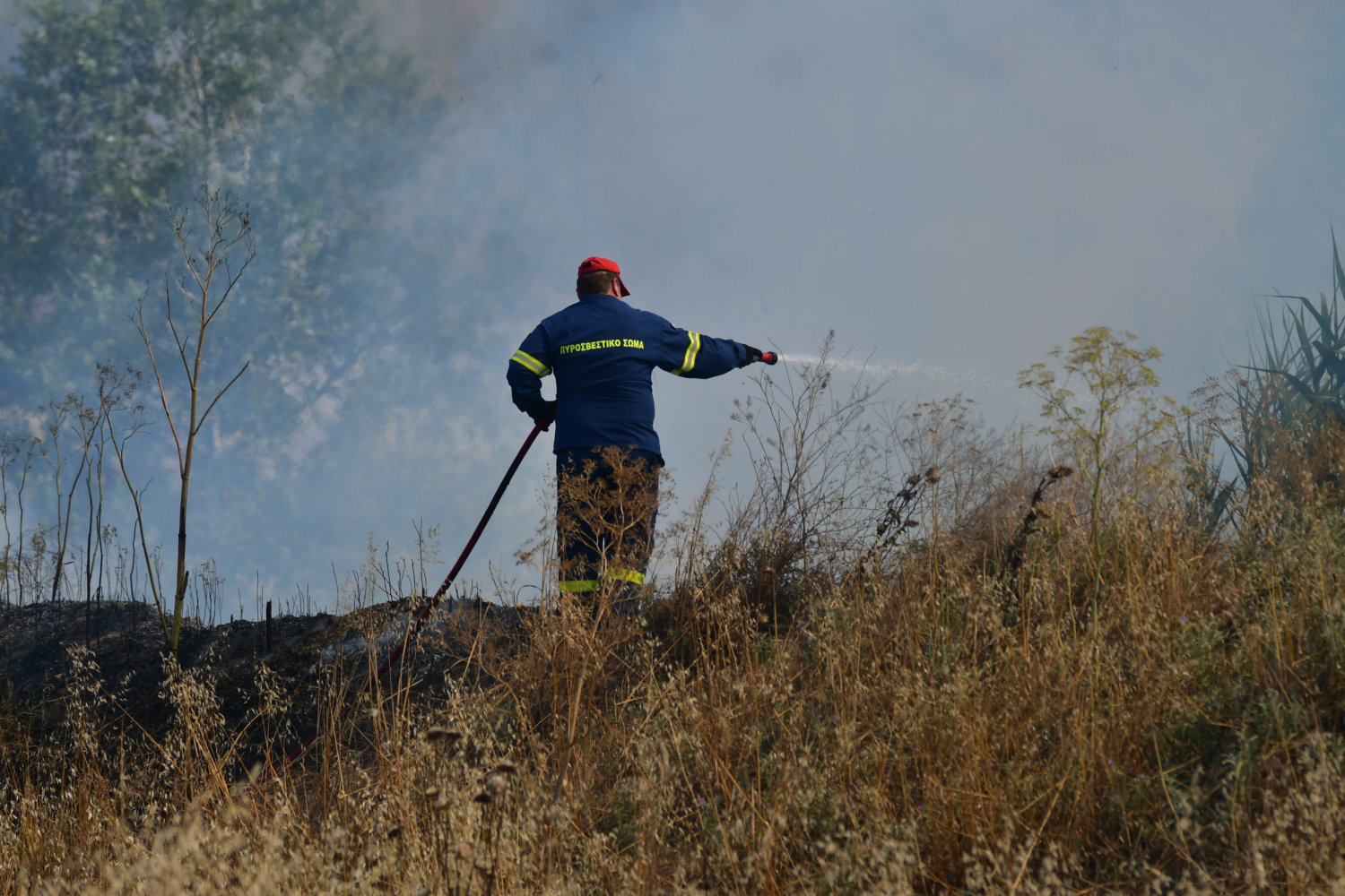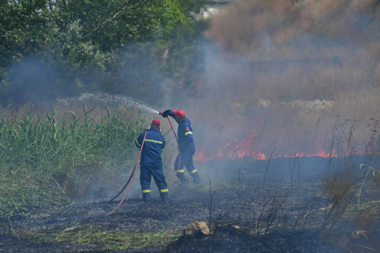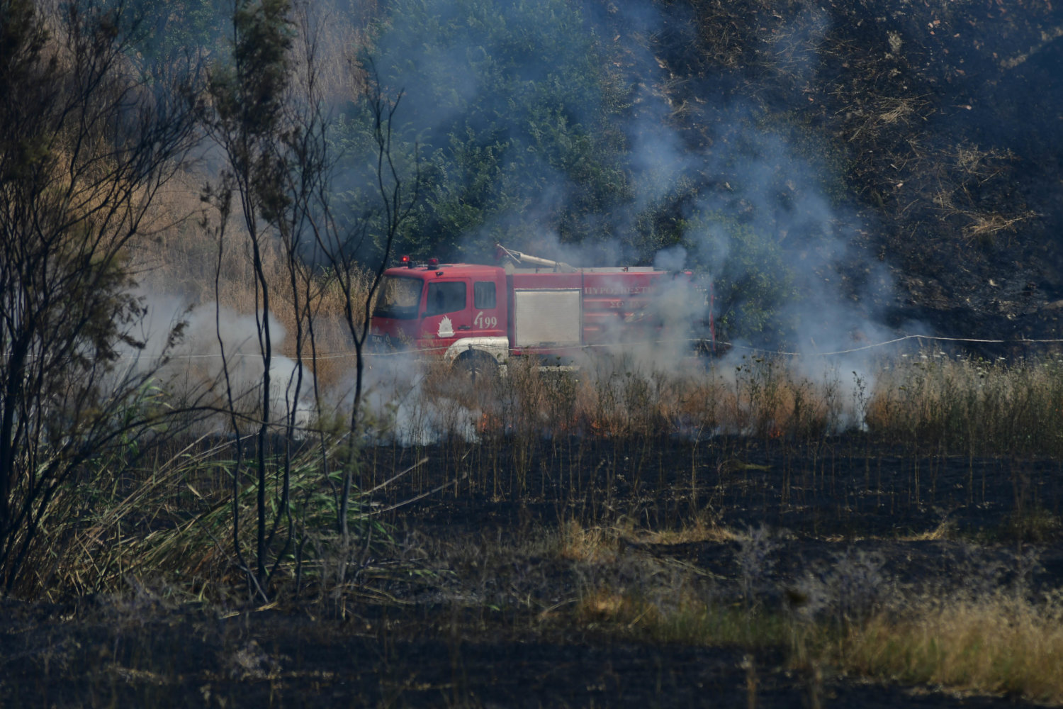 Στο σημείο βρίσκονται τέσσερα υδροφόρα οχήματα και 16 πυροσβέστες, αλλά και δυνάμεις της αστυνομίας για τη ρύθμιση της κυκλοφορίας.