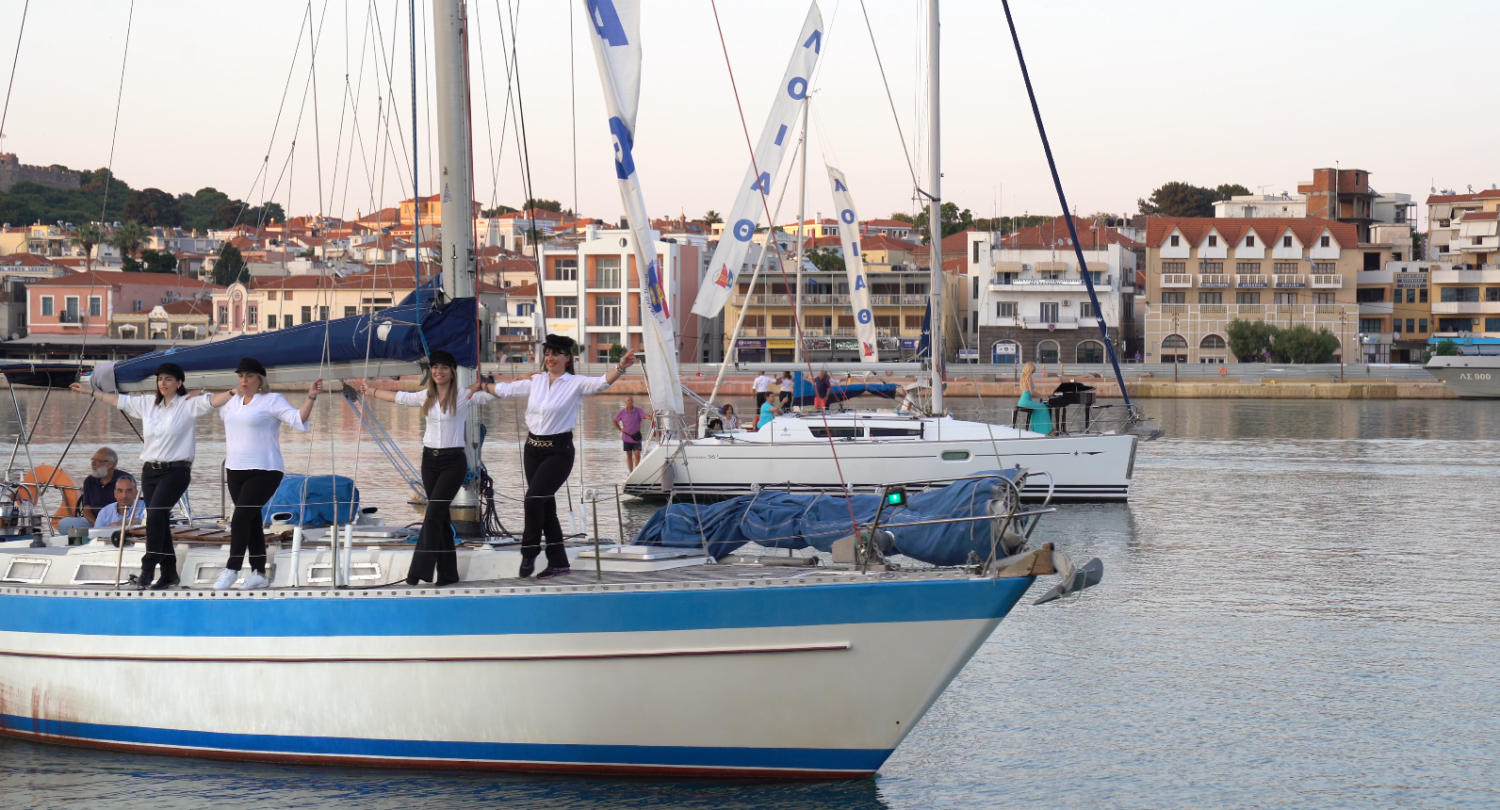 Στον εντυπωσιακό χώρο του λιμανιού ,τα ιστιοφόρα της Μυτιλήνης- ΛΟΙΑΘ (Λεσβιακού Ομίλου Ανοικτής θάλασσας) έπλεαν κυκλικά υπό τους ήχους της απίθανης πιανίστριας και τις δροσερές αύρες του Αιγαίου.