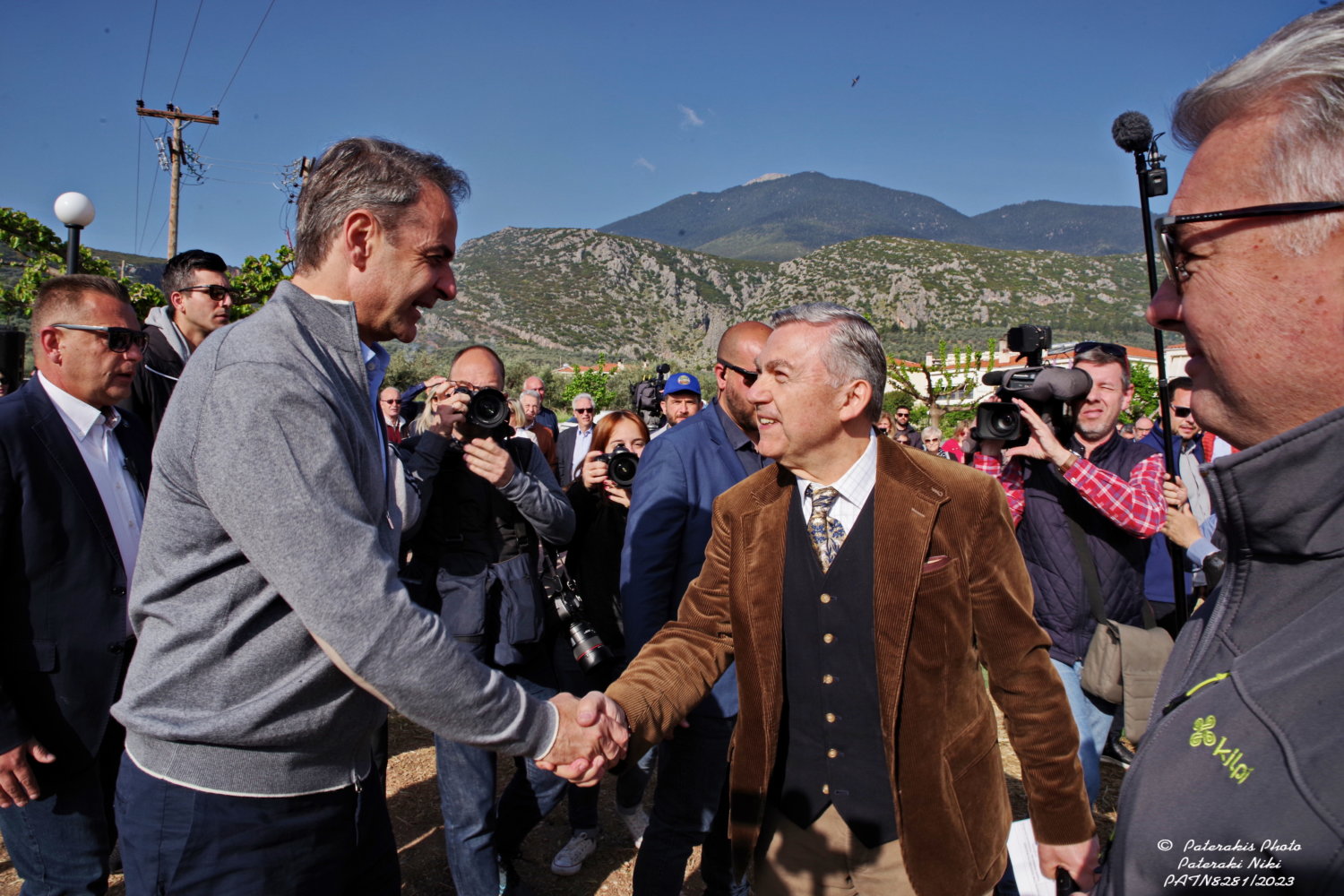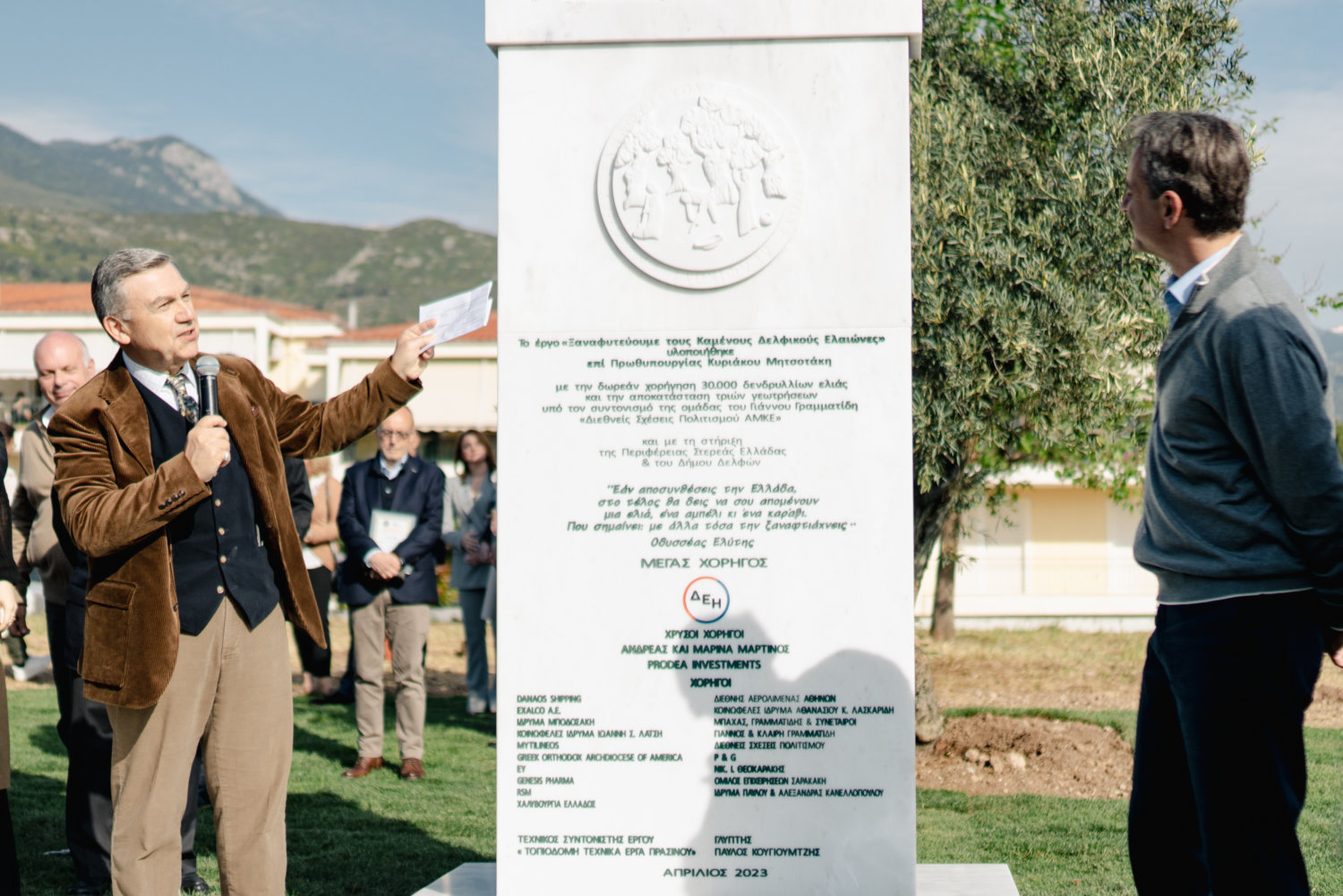 Κλείνοντας, ο κ. Μητσοτάκης ευχαρίστησε την ομάδα του έργου «Ξαναφυτεύουμε τους Καμένους Δελφικούς Ελαιώνες» και τον Γιάννο Γραμματίδη προσωπικά, την Τοπική Αυτοδιοίκηση για τη βοήθειά της σε όλη αυτήν την προσπάθεια, τους χορηγούς που αγκάλιασαν το έργο και το Γεωπονικό Πανεπιστήμιο, το οποίο συνδράμει καταθέτοντας την επιστημονική γνώση που απαιτείται για το καλύτερο αύριο του Ελαιώνα.