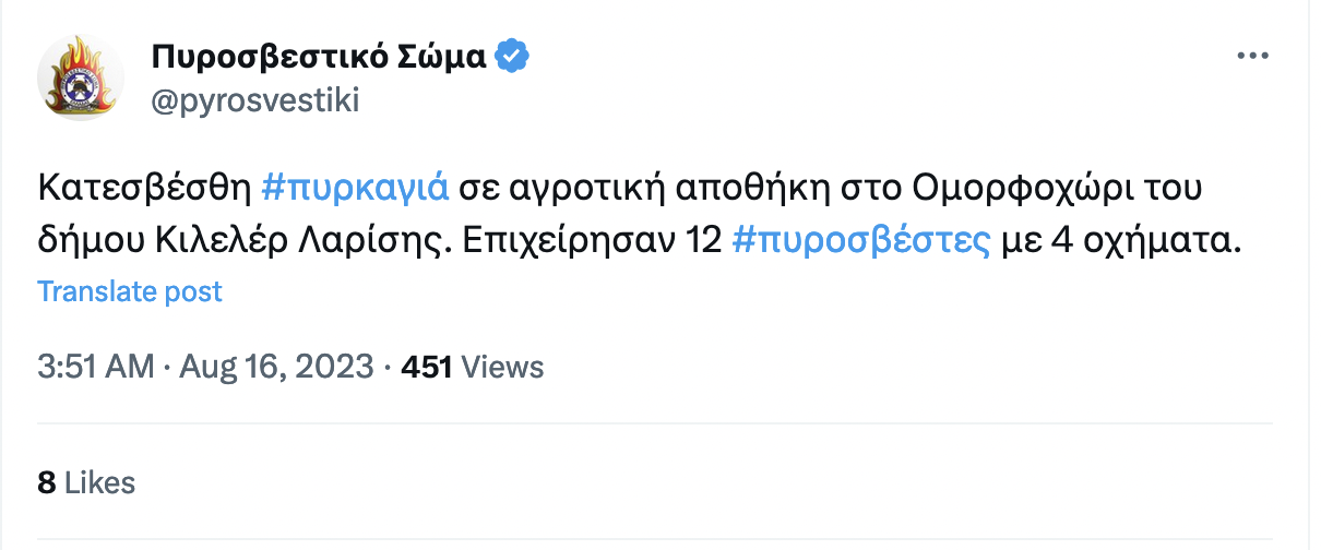 - Λίγο μετά τη 1 μετά τα μεσάνυχτα έσβησε η φωτιά που ξέσπασε σε αγροτική αποθήκη στην περιοχή του Ομορφοχωρίου. Στο συμβάν που ξεκίνησε αργά τη νύχτα της Τρίτης επιχείρησαν συνολικά 12 πυροσβέστες με 4 οχήματα. Από τις φλόγες προκλήθηκαν υλικές ζημιές στην αποθήκη. Η ανάρτηση που έγινε στο twitter από την Πυροσβεστική: