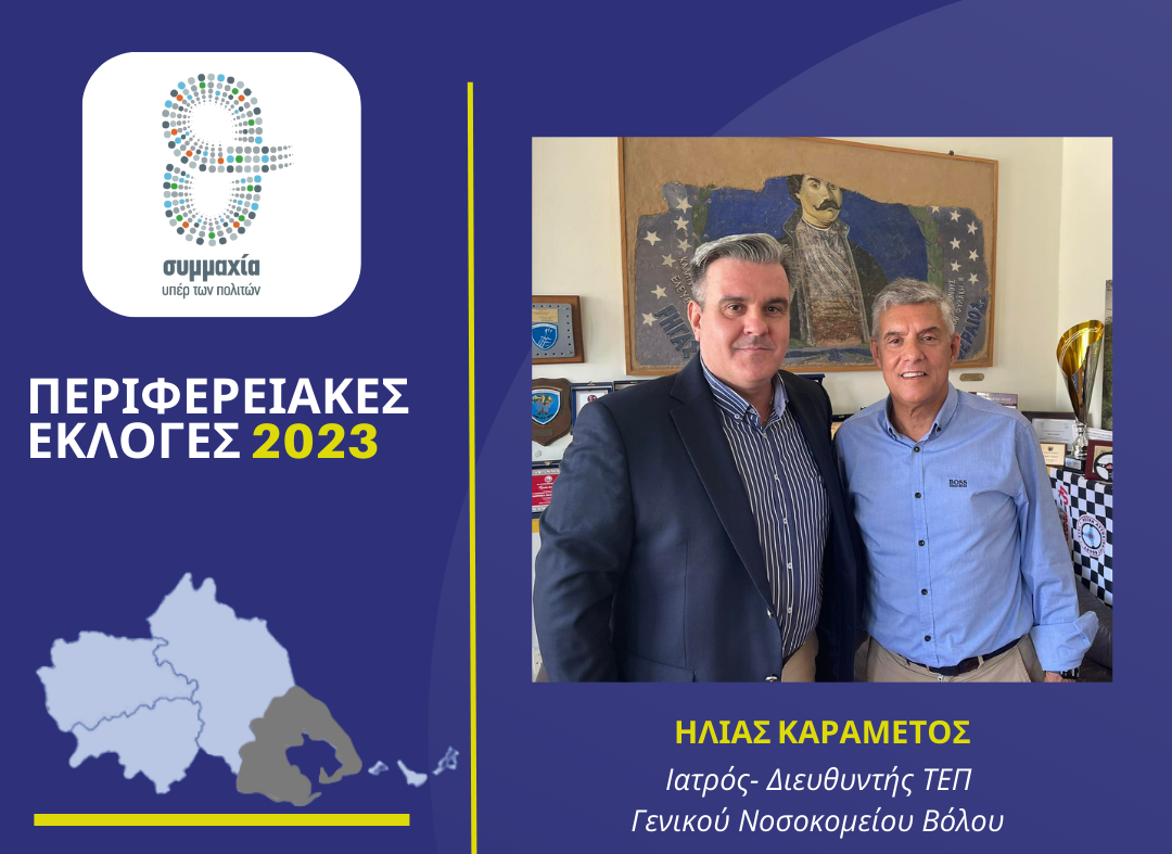 Τον Ιατρό Διευθυντή του Τμήματος Επειγόντων Περιστατικών του Γενικού Νοσοκομείου Βόλου Ηλία Καραμέτο που κατέρχεται υποψήφιος περιφερειακός σύμβουλος στην Π.Ε. Μαγνησίας στις αυτοδιοικητικές εκλογές του Οκτωβρίου, καλωσόρισε ο Περιφερειάρχης Θεσσαλίας Κώστας Αγοραστός στον συνδυασμό «Συμμαχία υπέρ των πολιτών» που έχει σταθερά στο επίκεντρο τον άνθρωπο και αγωνίζεται με έργα, δράσεις, πρωτοβουλίες για μια Περιφέρεια χωρίς διακρίσεις και αποκλεισμούς.