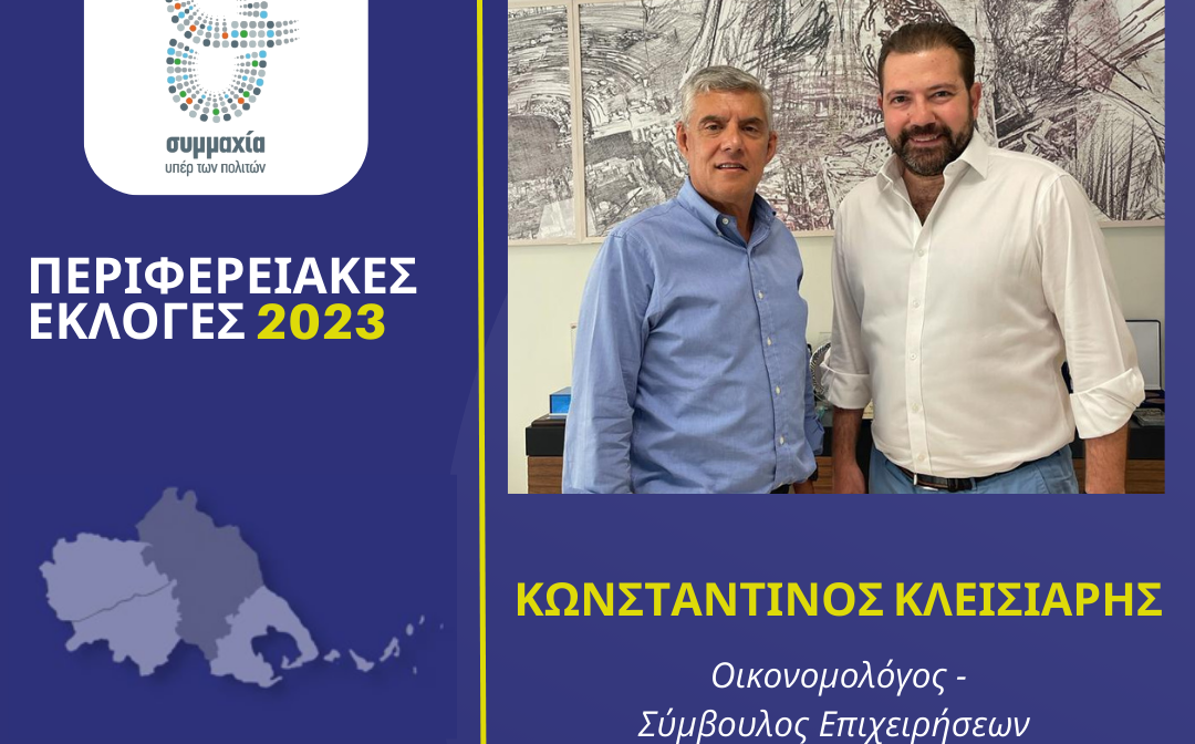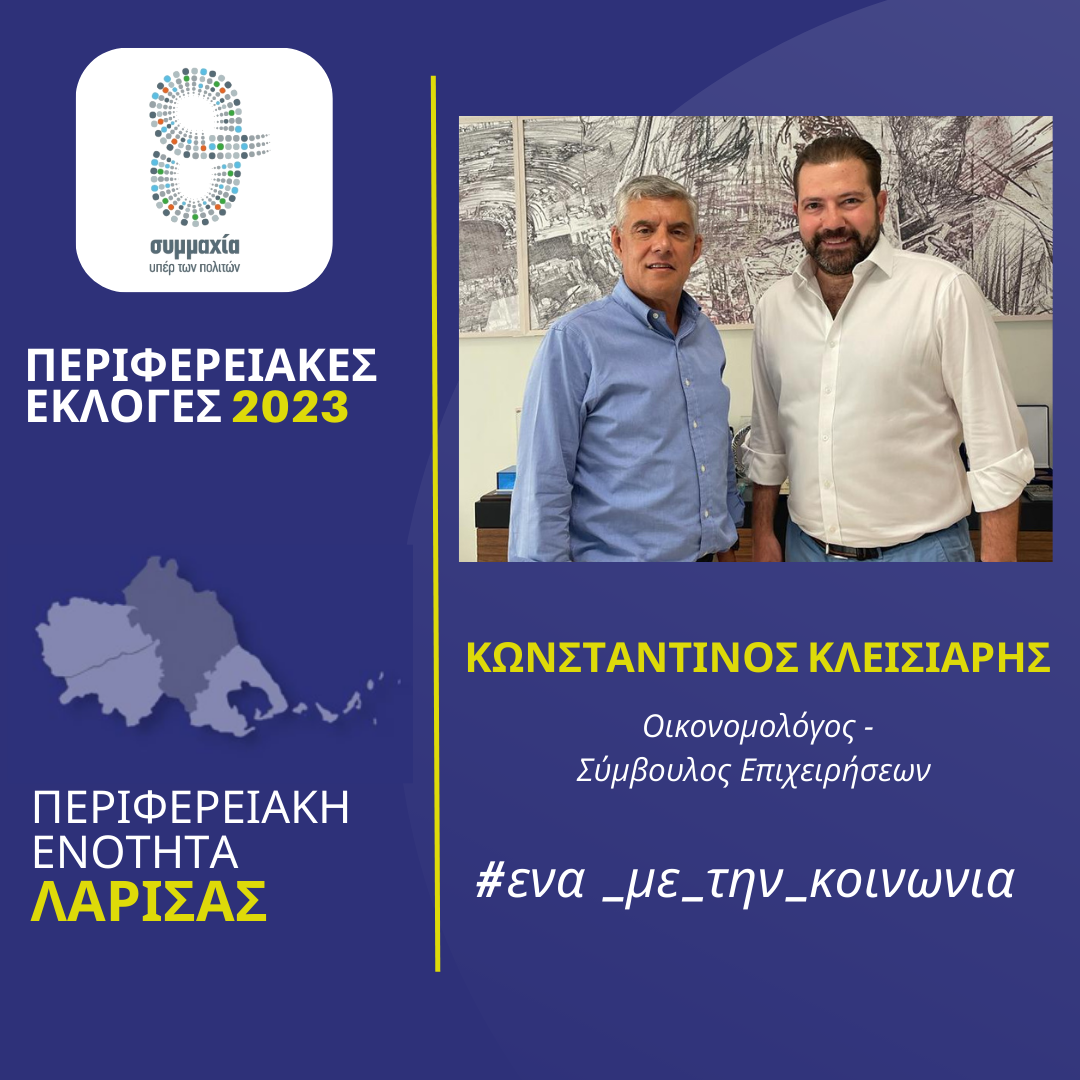 Τον Οικονομολόγο – Σύμβουλο Επιχειρήσεων Κωνσταντίνο Κλεισιάρη που κατέρχεται υποψήφιος περιφερειακός σύμβουλος στην Π.Ε. Λάρισας στις αυτοδιοικητικές εκλογές του Οκτωβρίου, καλωσόρισε ο Περιφερειάρχης Θεσσαλίας Κώστας Αγοραστός στον συνδυασμό «Συμμαχία υπέρ των πολιτών» που έχει σταθερά στο επίκεντρο τον άνθρωπο και αγωνίζεται με έργα, δράσεις, πρωτοβουλίες για μια Περιφέρεια χωρίς διακρίσεις και αποκλεισμούς.