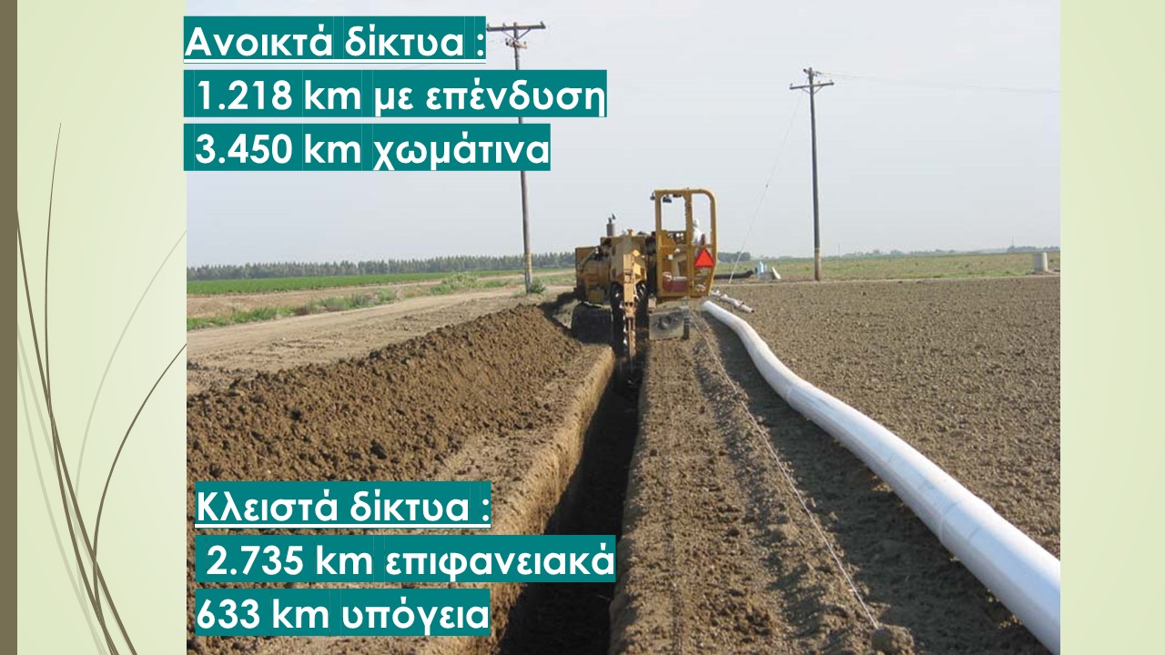 «….η επιφανειακή άρδευση αντιπροσωπεύει μόλις το 30% των χρησιμοποιούμενων μεθόδων άρδευσης, γεγονός που καταδεικνύει τις τεράστιες δυνατότητες βελτίωσης του βαθμού απόδοσης των αρδεύσεων και, άρα, της εξοικονόμησης ύδατος».