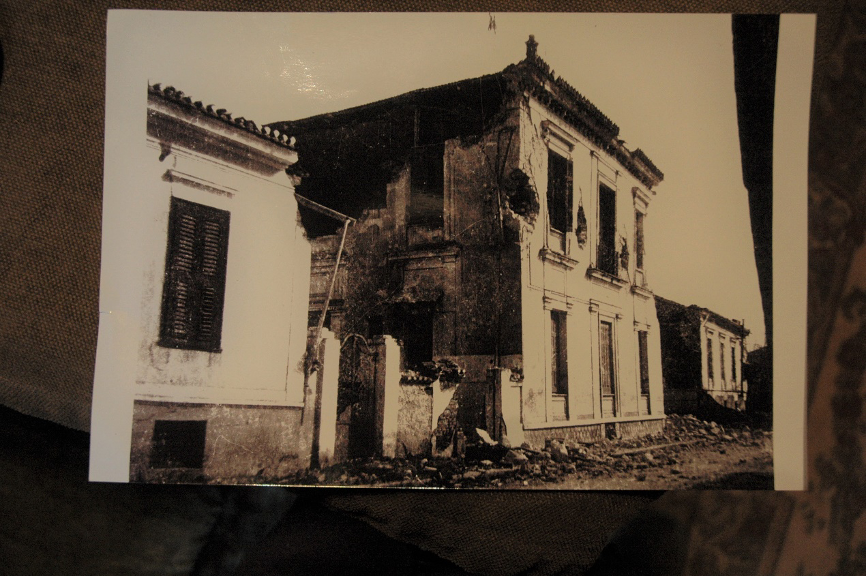 Το κτήριο υπέστη εκτεταμένες ζημιές κατά τον σεισμό της 1ης Μαρτίου 1941, οπότε και καταστράφηκε ολοσχερώς ο όροφος. Κατά την μεταπολεμική αποκατάσταση των ζημιών, ανακατασκευάστηκε πλήρως ο όροφος και η στέγη, ενώ το αρχικό ξύλινο πάτωμα αντικαταστάθηκε από πλάκα οπλισμένου σκυροδέματος, πράγμα που απαίτησε την προσθήκη δοκών και υποστυλωμάτων, εσωτερικά, σε επαφή με την διατηρημένη αρχική λιθοδομή της τοιχοποιίας του ισογείου. Σ’ αυτή τη φάση πραγματοποιήθηκε η μικρή διώροφη προσθήκη κατ’ έκταση, για την εξασφάλιση χώρων υγιεινής, και προστέθηκαν οι περιμετρικοί εξώστες.