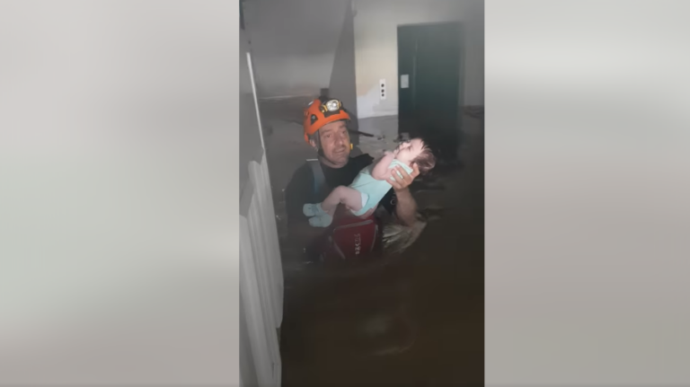 Ο διασώστης ακούγεται να λέει “ψυχούλα μου” για το μωρό ενώ ο συνάδελφός του που το κρατάει στα χέρια του μόλις κατάφερε να περάσει από τα νερά που είχαν πλημμυρίσει το σπίτι, ακούγεται να λέει «έλα να το πάρει η μαμά στην αγκαλιά» και το παιδάκι δίνεται από το διασώστη στη μητέρα του που ξεσπάει σε λυγμούς.
