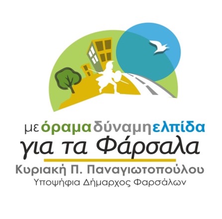 «Το έμβλημα του συνδυασμού είναι συνδυαστικό, αποτελούμενο από γραφική και λεκτική απεικόνιση. Η γραφική απεικόνιση αποτελεί το έμβλημα του συνδυασμού και απεικονίζει ένα δέντρο, ένα δρόμο που διακρίνονται δύο κτήρια, το άγαλμα του Αχιλλέα, ένα περιστέρι και η λεκτική αποτελείται από τη φράση «με όραμα, δύναμη, ελπίδα για τα Φάρσαλα, Κυριακή Π. Παναγιωτοπούλου Υποψήφια Δήμαρχος Φαρσάλων».» στον οποίο περιλαμβάνονται η ΠΑΝΑΓΙΩΤΟΠΟΥΛΟΥ ΚΥΡΙΑΚΗ του ΠΑΝΑΓΙΩΤΗ, ως υποψήφια Δήμαρχος, ως υποψήφιοι, δε, δημοτικοί σύμβουλοι οι: