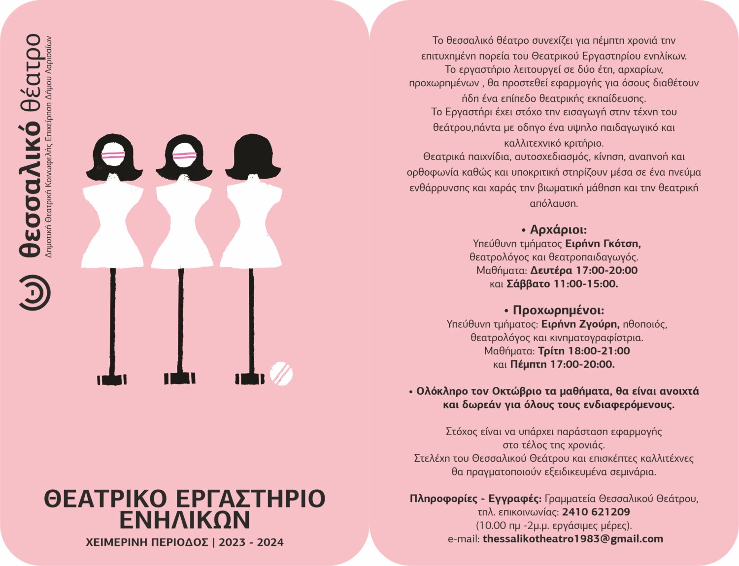 Πληροφορίες – Εγγραφές: Γραμματεία Θεσσαλικού Θεάτρου, τηλ. επικοινωνίας: 2410 621209 Δευτέρα – Παρασκευή 10:00-14:00.