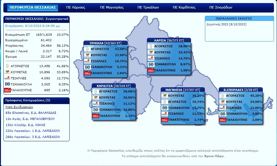 Αναρτήθηκαν στο site της Περιφέρειας Θεσσαλίας τα εκλογικά αποτελέσματα από 165 εκλογικά τμήματα και στις τέσσερις Περιφερειακές Ενότητες.