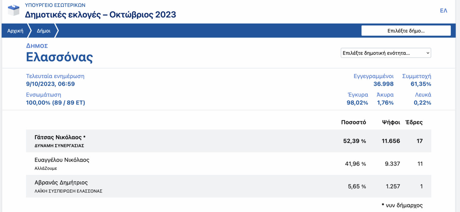 Άνετα επικράτησε ο Νίκος Γάτσας στον Δήμο Ελασσόνας, ανανεώνοντας τη θητεία της Δημοτικής Αρχής.