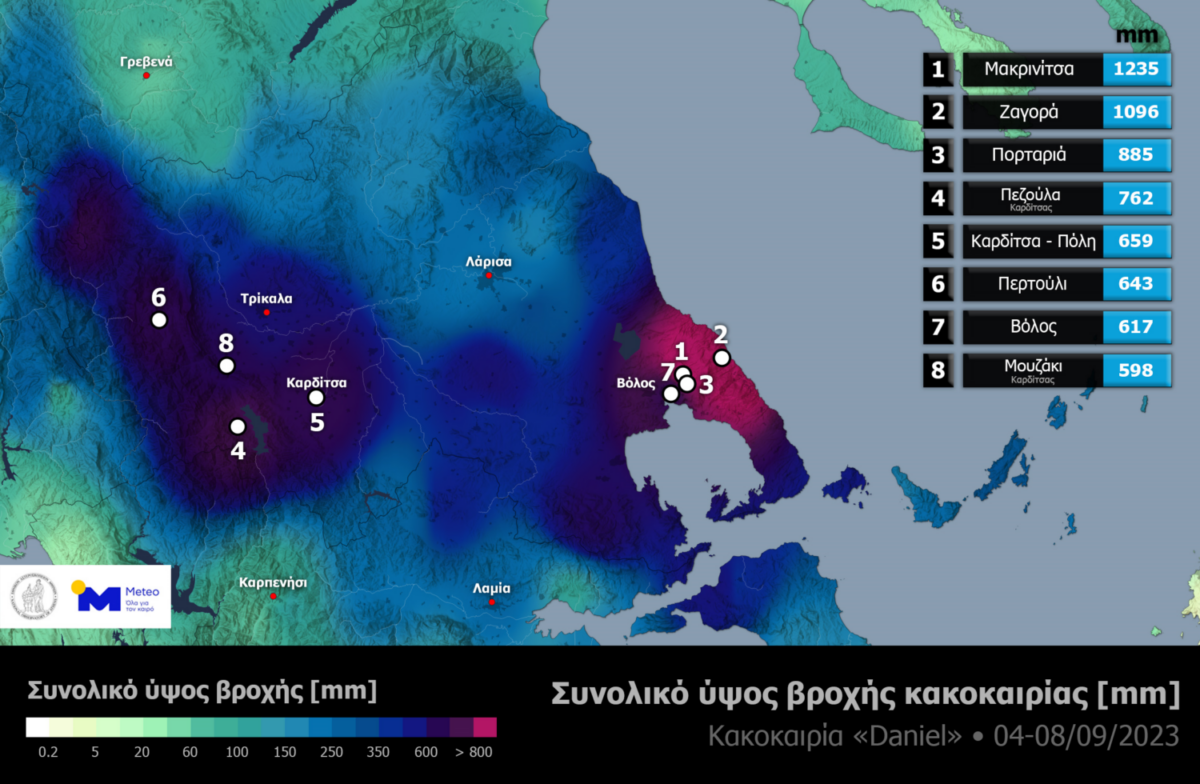 Το τετραήμερο της Δευτέρας 04/09 ως και την Πέμπτη 07/09/2023, μια πρωτοφανής κακοκαιρία (κακοκαιρία «Δανιήλ») έπληξε με διάρκεια και σφοδρότητα αρκετές περιοχές της χώρας, με τη μεγαλύτερη ένταση των φαινομένων στην περιοχή της Θεσσαλίας. Κατά τη διάρκεια της κακοκαιρίας, καταρρίφθηκαν πολλά ρεκόρ στη χώρα μας, όπως το ημερήσιο ύψος βροχής (Ζαγορά, Μακρινίτσα και Βόλος) αλλά και μηνιαίου ύψους βροχής (Μακρινίτσα). Βάσει προσεγγιστικών υπολογισμών εκτιμάται ότι στη λεκάνη απορροής του Πηνειού ποταμού (η οποία περιλαμβάνει το μεγαλύτερο μέρος της Θεσσαλίας) έπεσαν συνολικά πάνω από 5 δισεκατομμύρια κυβικά μέτρα νερού, ποσότητα που αντιστοιχεί στην κατανάλωση νερού δεκατεσσάρων χρόνων στην Αττική. Ο χάρτης που ακολουθεί παρουσιάζει τα συνολικά ύψη βροχής στην ευρύτερη περιοχή της Θεσσαλίας κατά τη διάρκεια της κακοκαιρίας.
