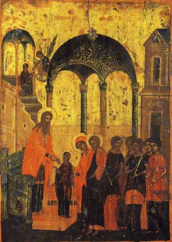 “Ο καθαρώτατος ναὸς του Σωτήρος, η πολυτίμητος παστὰς και Παρθένος, το ιερὸν θησαύρισμα της δόξης του Θεού, σήμερον εισάγεται, εν τω οίκω Κυρίου, την χάριν συνεισάγουσα, την εν Πνεύματι θείω· ην ανυμνούσιν Άγγελοι Θεού. Αύτη υπάρχει σκηνὴ επουράνιος.” (Κοντάκιο)