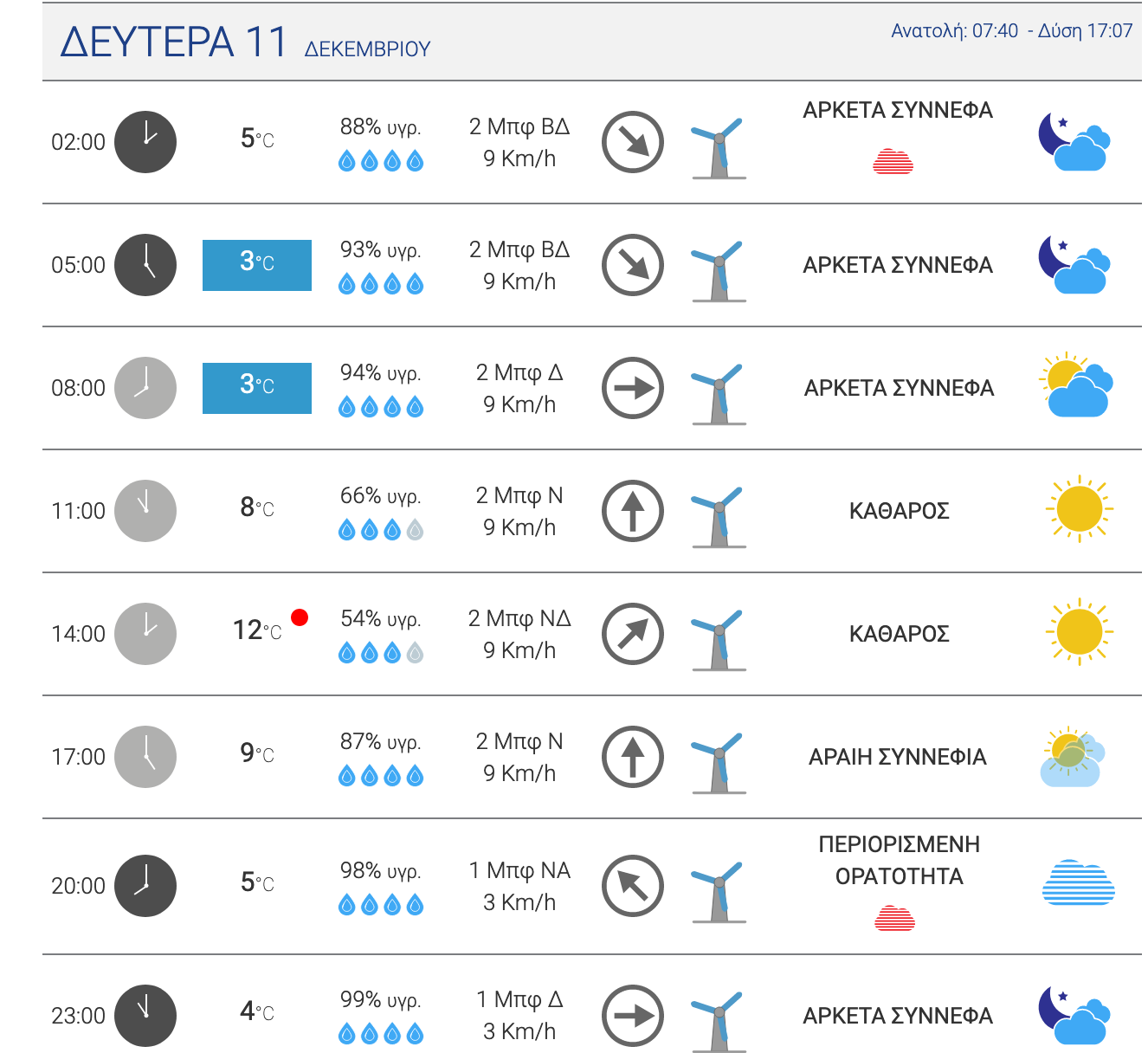Τη Δευτέρα 11 Δεκεμβρίου 2023 αναμένονται βροχές και καταιγίδες με σταδιακή βελτίωση του καιρού. Άνεμοι έως 7 μποφόρ στο Νοτιοδυτικό Αιγαίο. Θερμοκρασία σε φυσιολογικά για την εποχή επίπεδα.