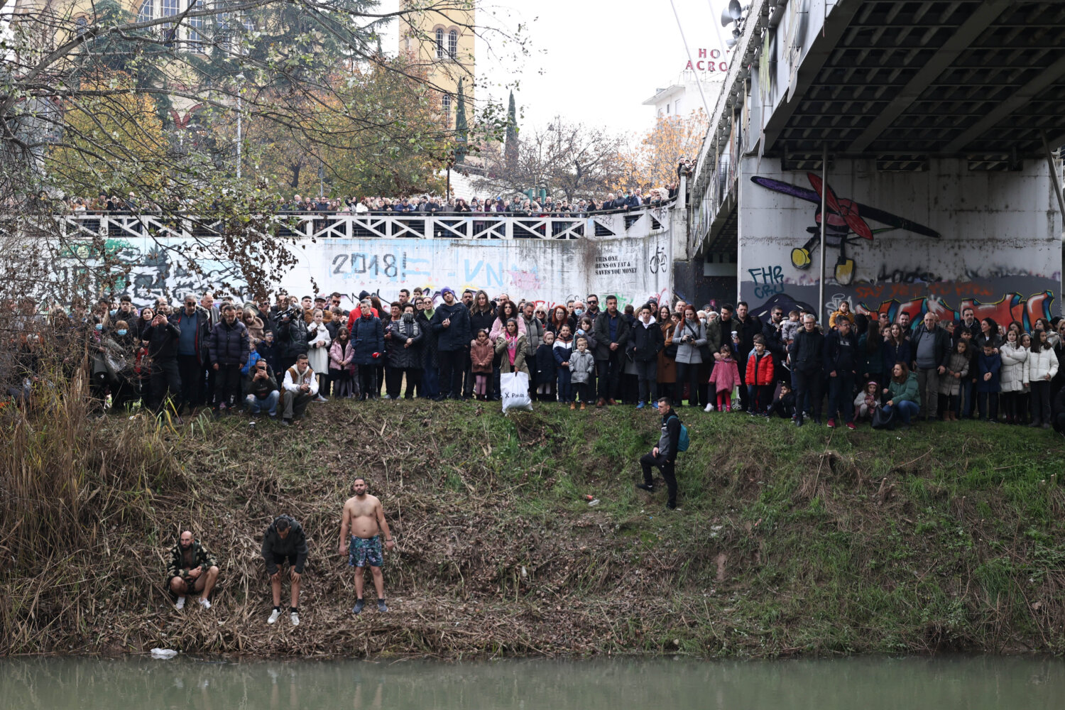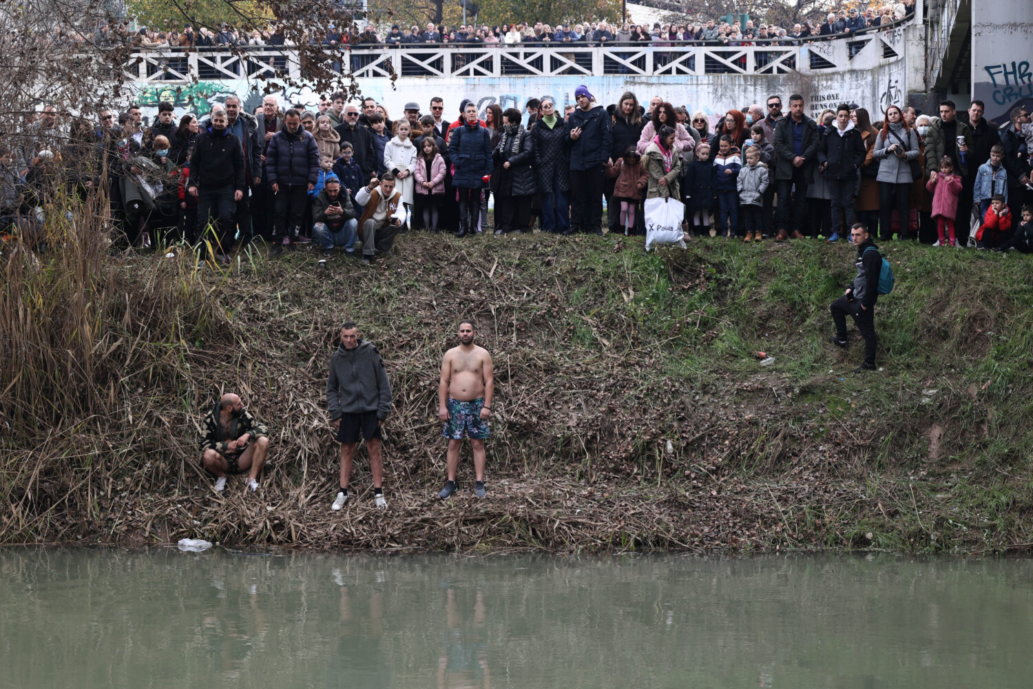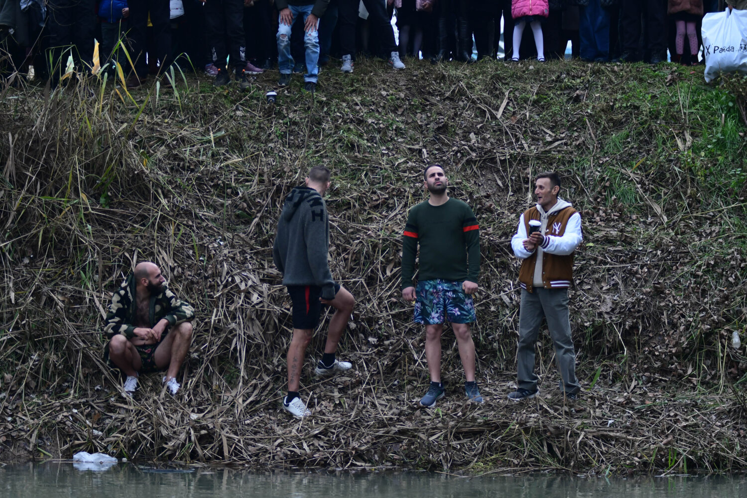 Συμπολίτες επίσης ετοιμάζονται να πέσουν στα νερά του ποταμού, ώστε να πιάσουν τον Σταυρό. Μάλιστα, ήδη έχει απλωθεί μία ελληνική σημαία, όπως και η σημαία της Παλαιστίνης.