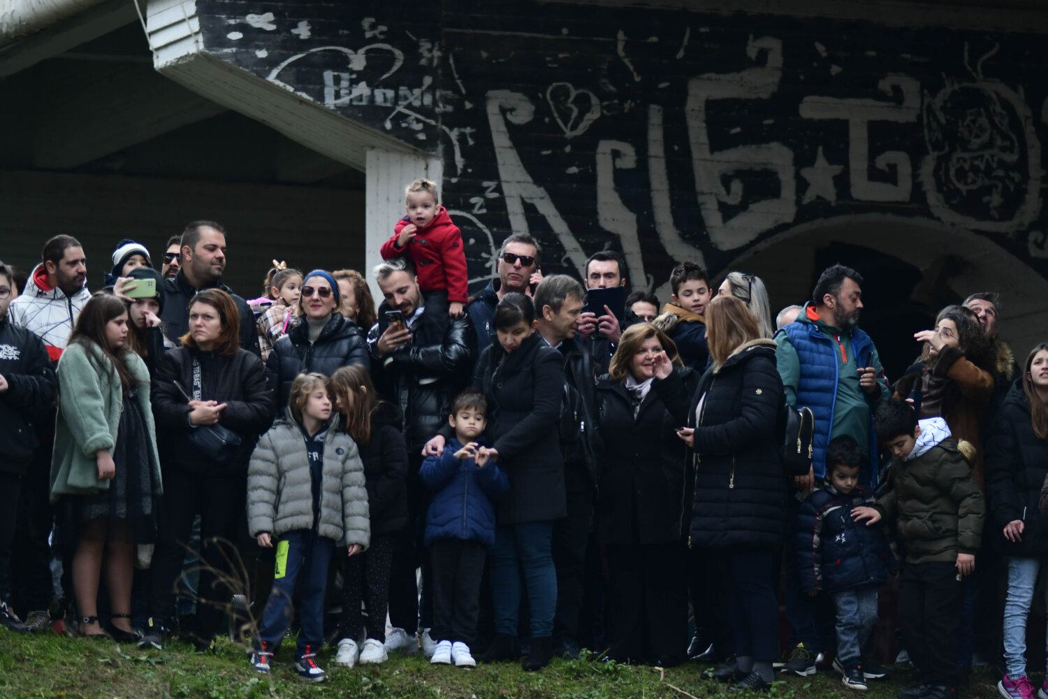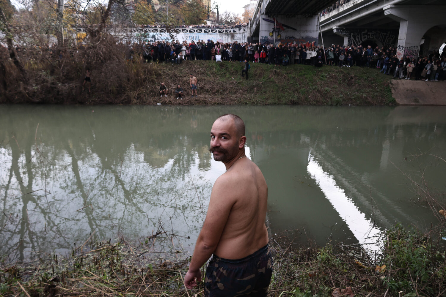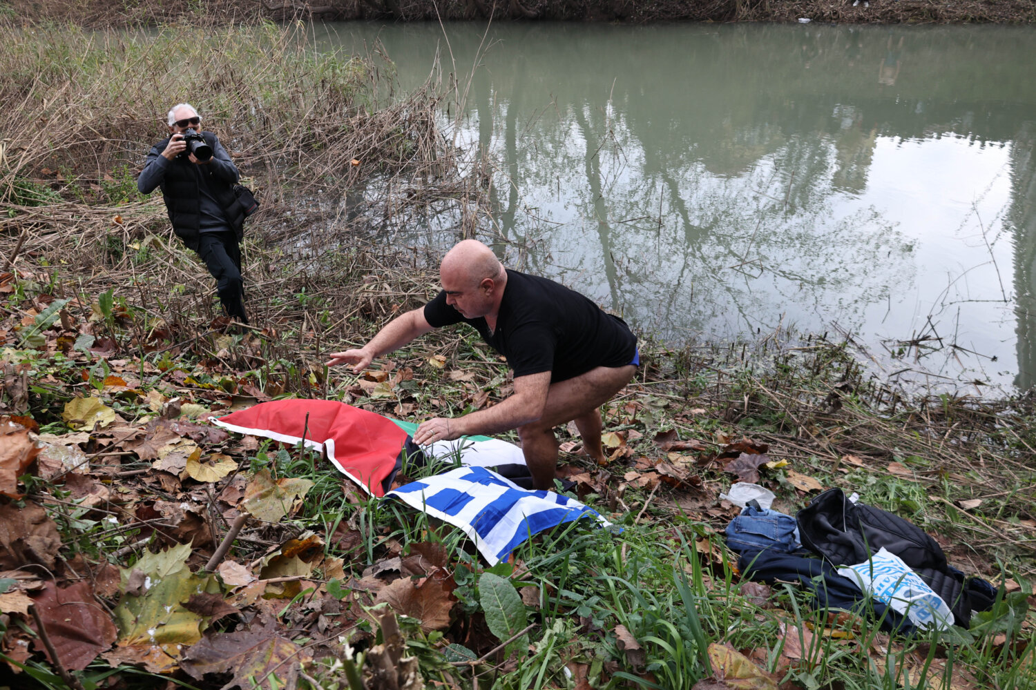 Συμπολίτες επίσης ετοιμάζονται να πέσουν στα νερά του ποταμού, ώστε να πιάσουν τον Σταυρό. Μάλιστα, ήδη έχει απλωθεί μία ελληνική σημαία, όπως και η σημαία της Παλαιστίνης.