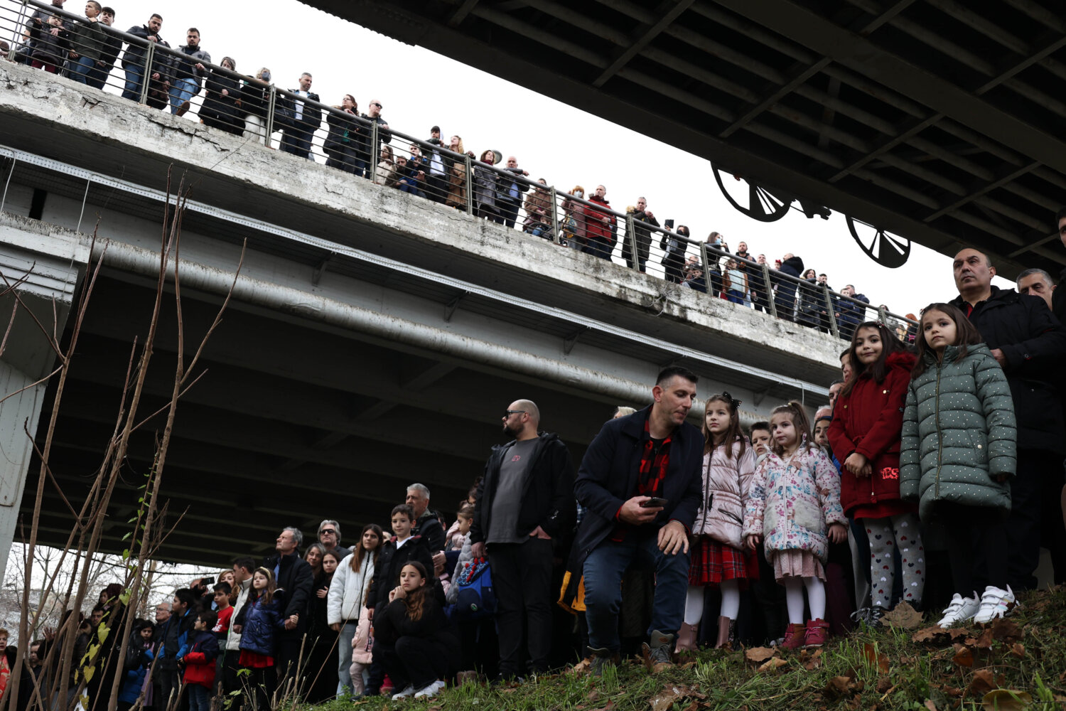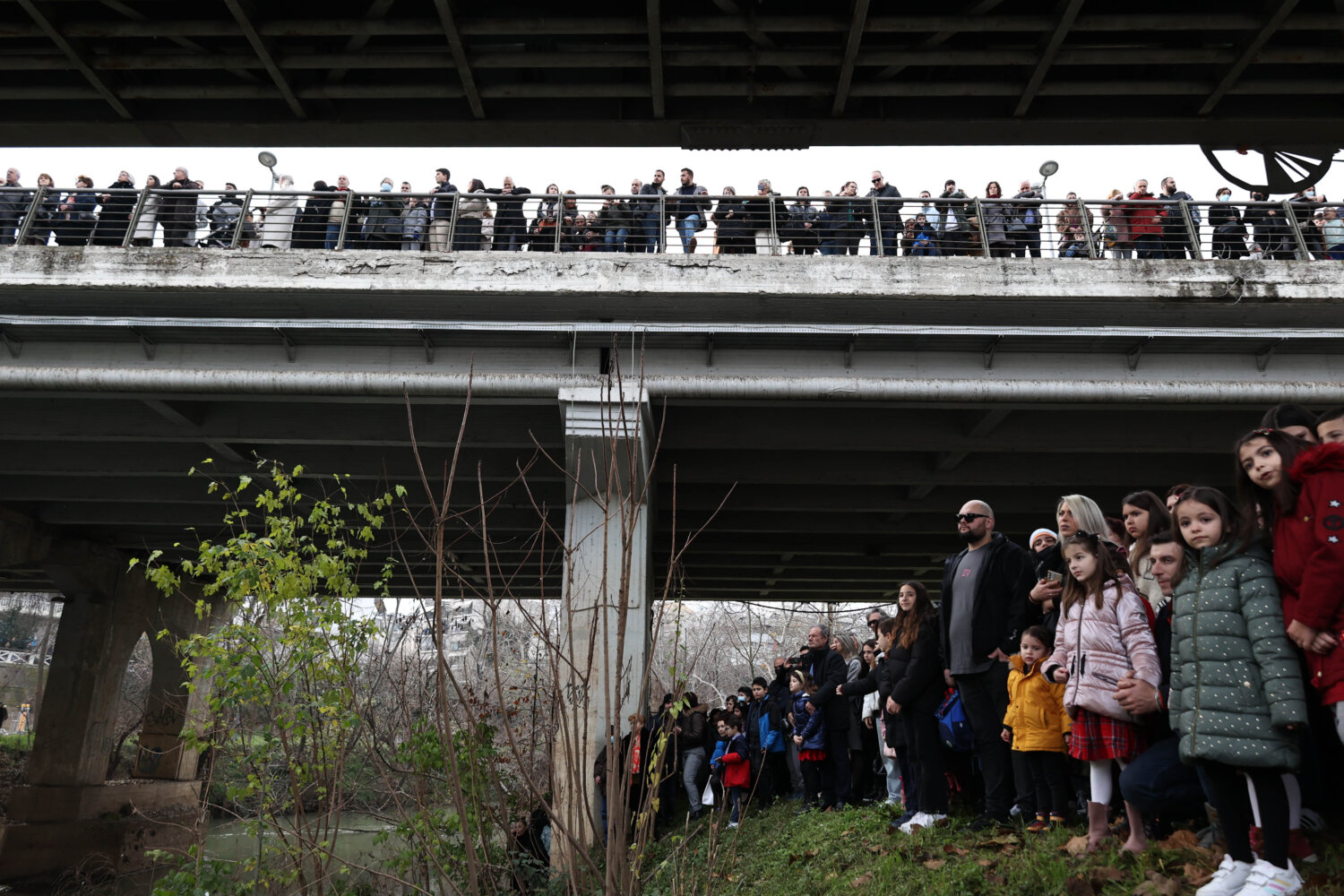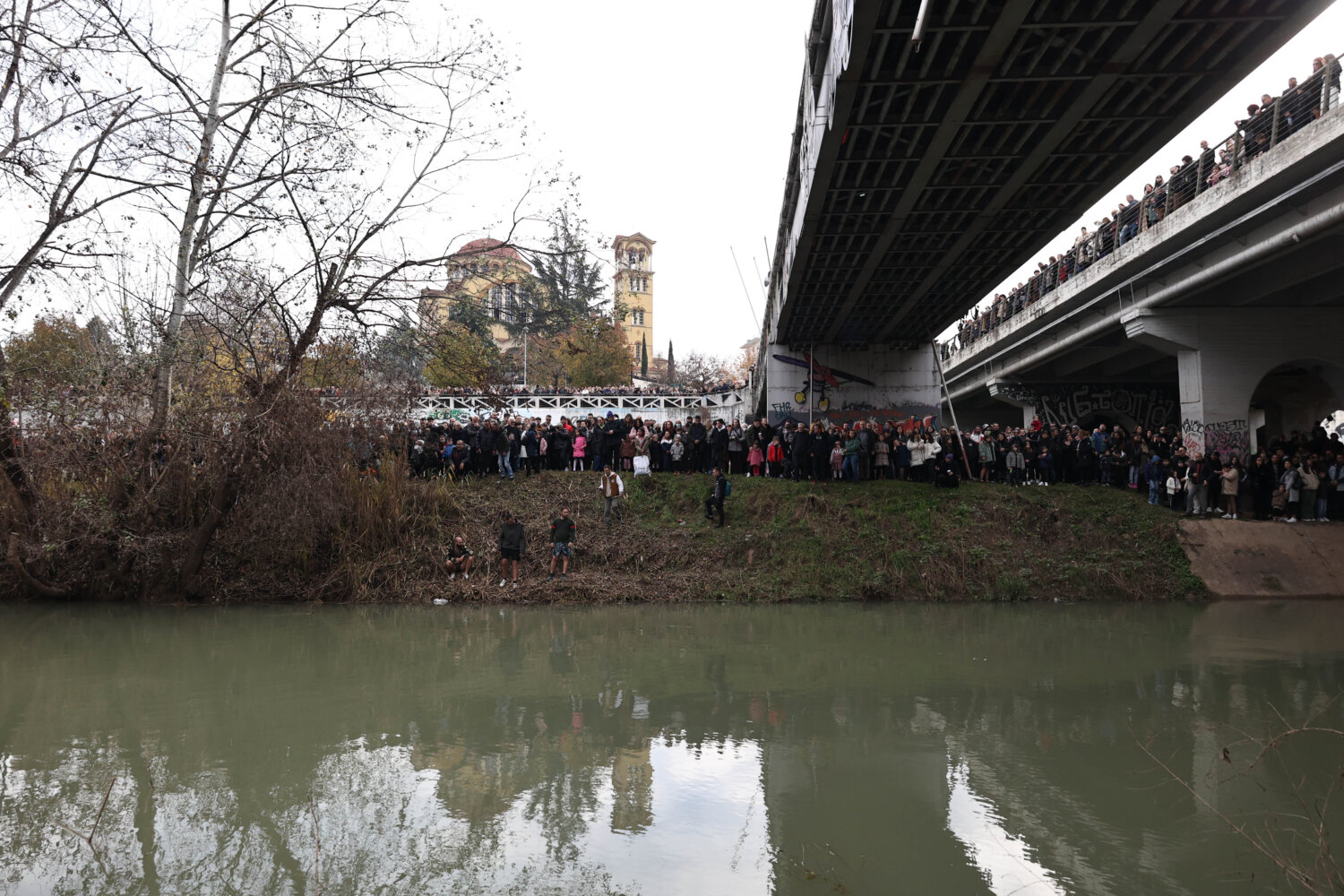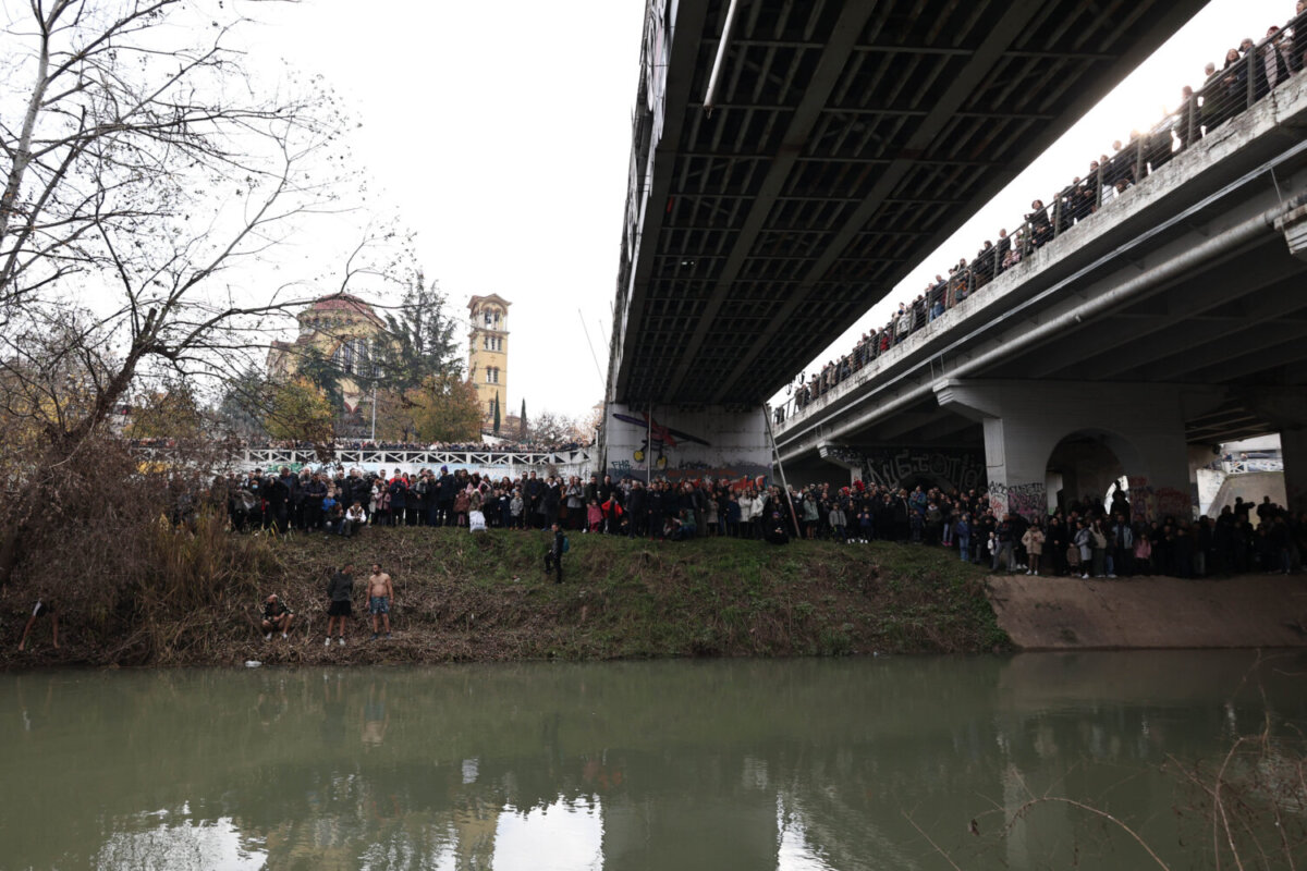 Πλήθος Λαρισαίων βρίσκεται αυτή την ώρα στη γέφυρα – όπως και στην κοίτη – του Πηνειού αναμένοντας την κατάδυση του Τιμίου Σταυρού.