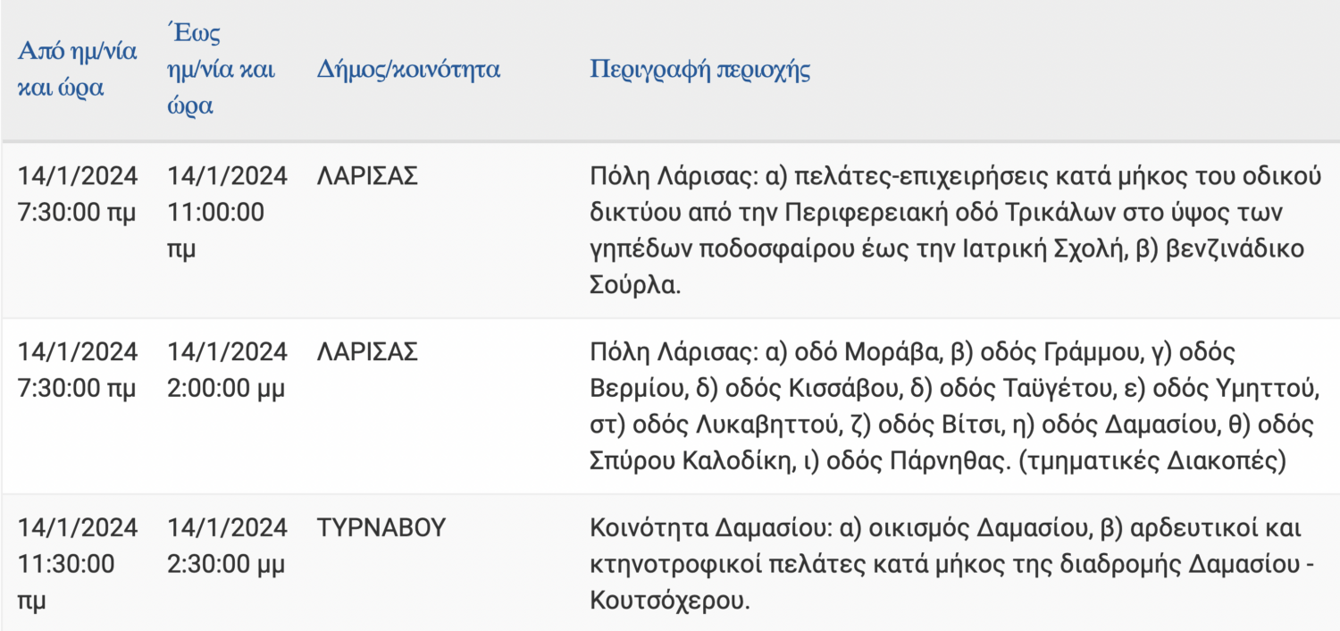 Σε προγραμματισμένες διακοπές στην παροχή ηλεκτρικού ρεύματος σε δρόμους της Λάρισας και περιοχές της Περιφερειακής Ενότητας θα προχωρήσει αύριο Κυριακή 14 Ιανουαρίου 2024 ο ΔΕΔΔΗΕ Α.Ε.